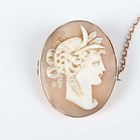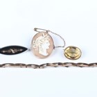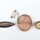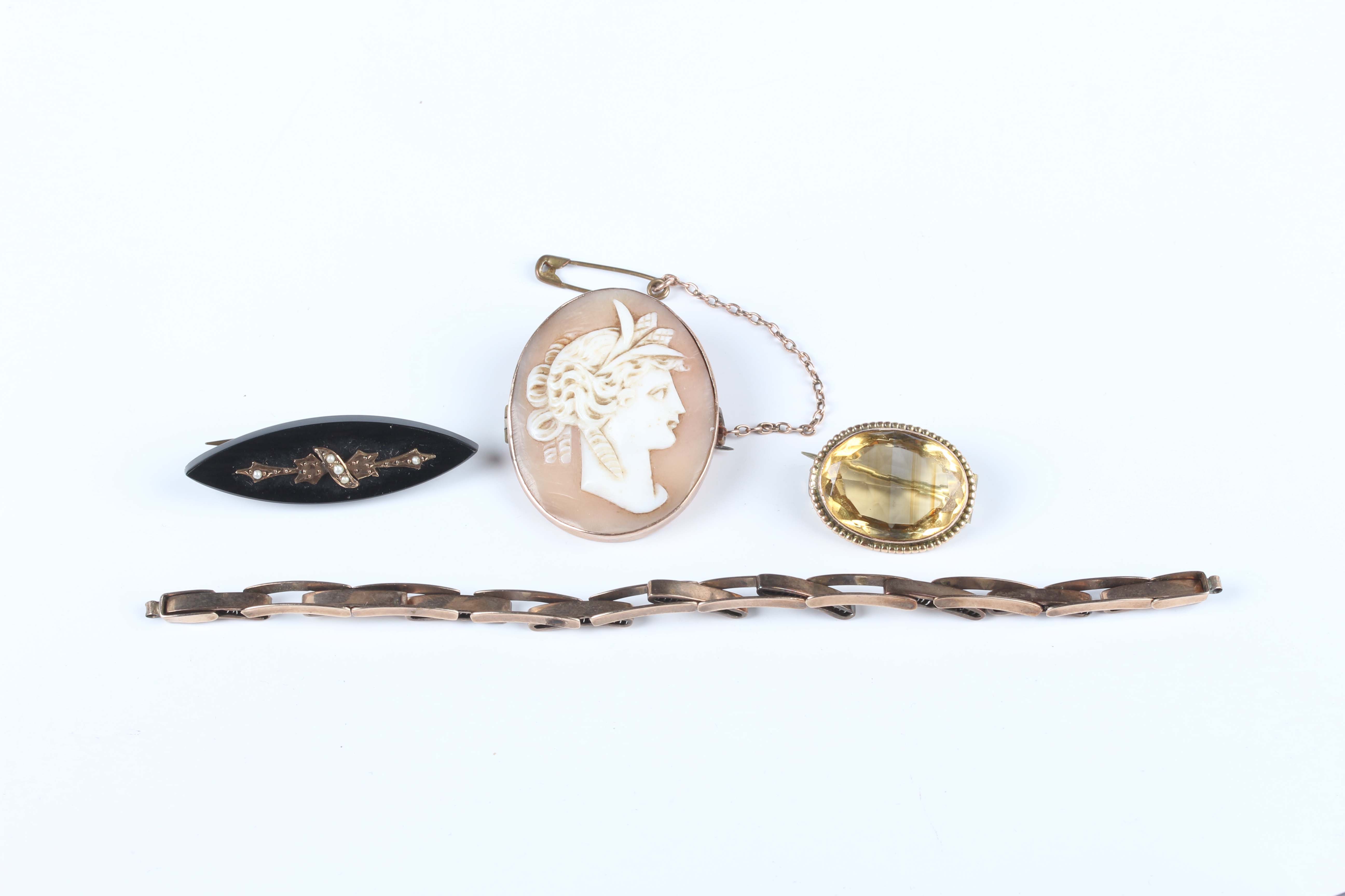A gold mounted oval shell cameo brooch, carved as a portrait of a classical lady, detailed ‘9ct’, weight 6.8g, width 2.8cm, a gold and citrine single stone brooch, unmarked, weight 4.5g, a gold expanding wristwatch bracelet, detailed ‘9ct’, weight 5.2g, and a seed pearl and black onyx brooch.