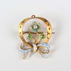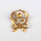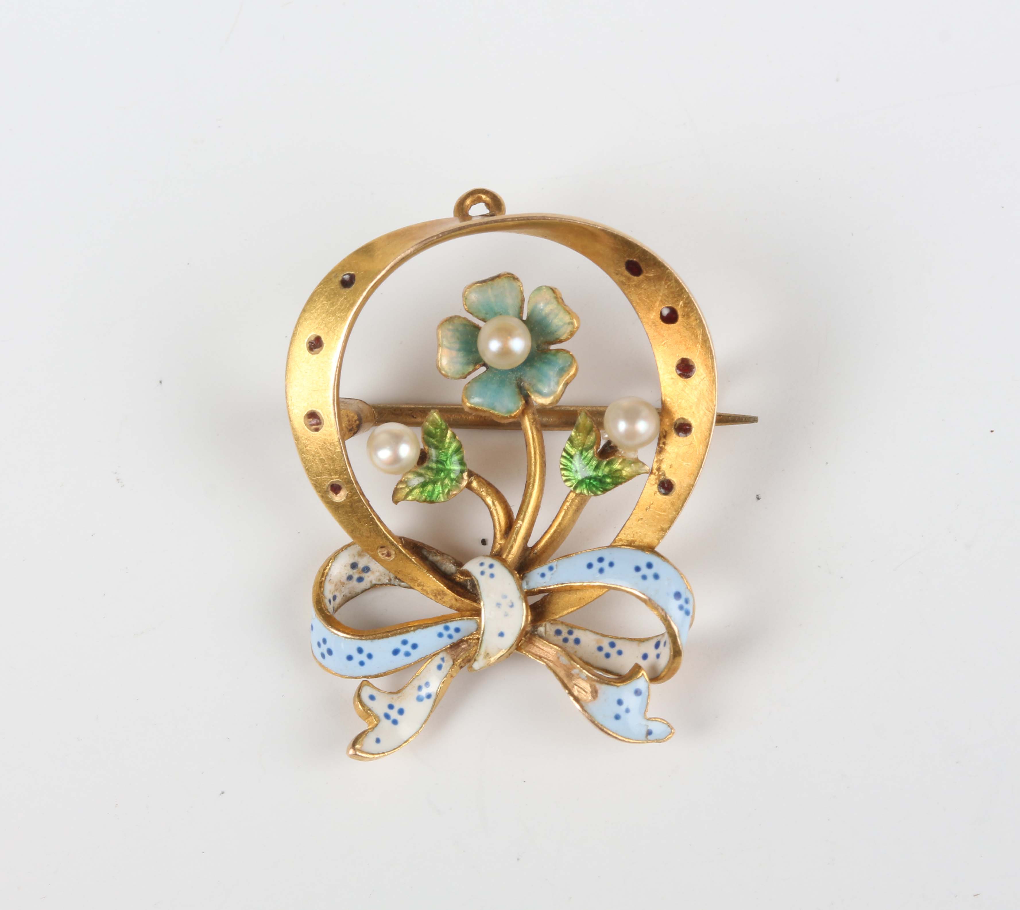A gold, enamelled and seed pearl brooch, designed as a floral spray above a tied ribbon bow, detailed ‘15ct’, weight 3.1g, width 1.9cm.