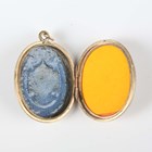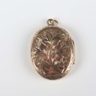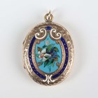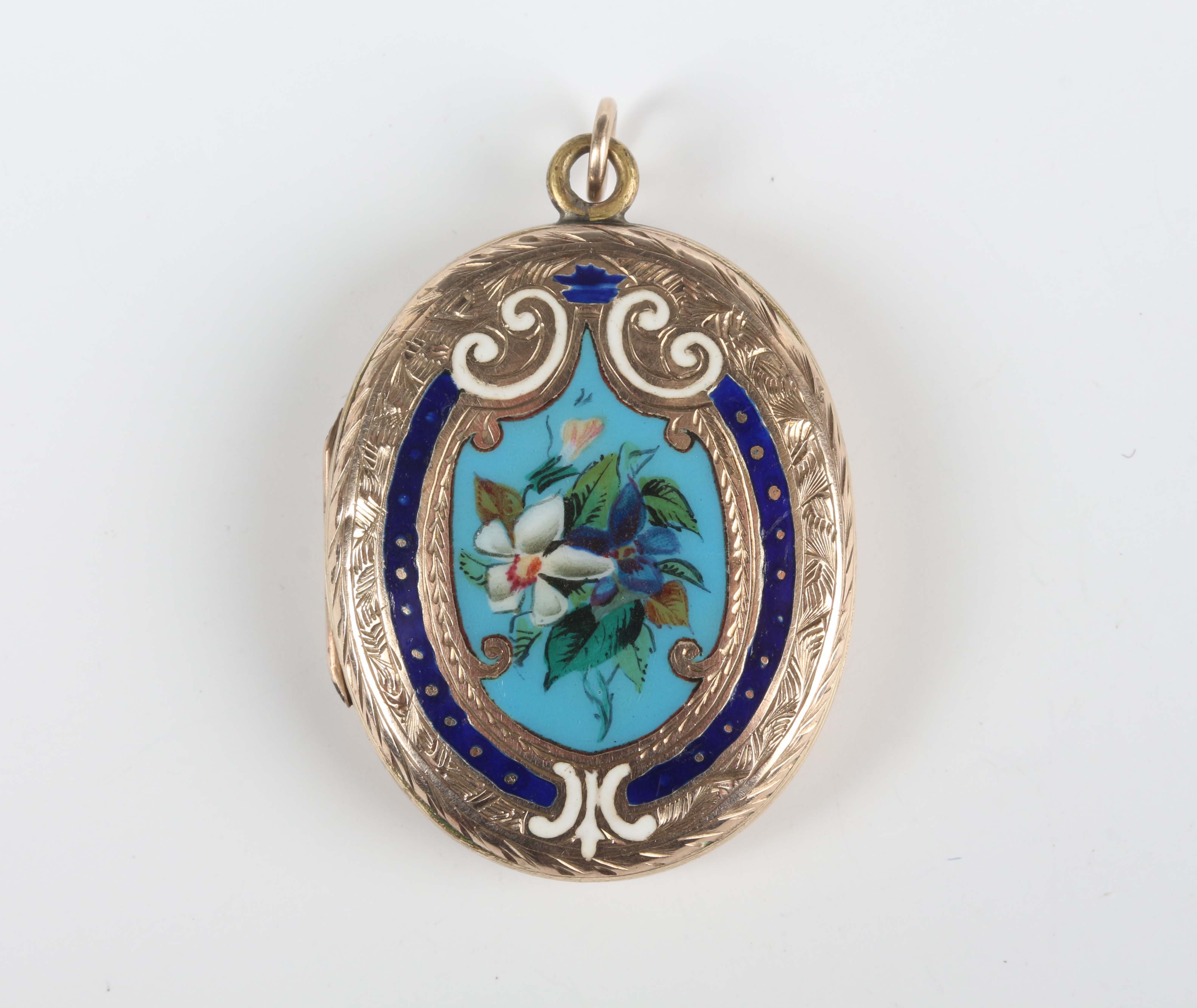 A gold back and front and enamelled oval pendant locket, the front decorated with a floral spray, otherwise with engraved decoration, unmarked, weight 7.4g, length 3.8cm.