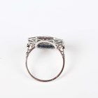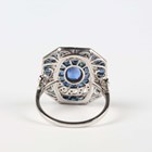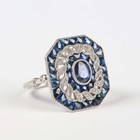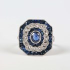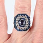 A platinum, sapphire and diamond octagonal panel ring, collet set with the principal oval cut sapphire within a surround of calibre cut sapphires, otherwise with a ropetwist motif, mounted with circular cut diamonds, and an outer border of calibre cut sapphires, detailed ‘Pt950’, weight 5.9g, principal sapphire weight approx 0.61ct, ring size approx N.