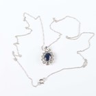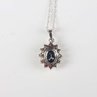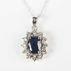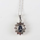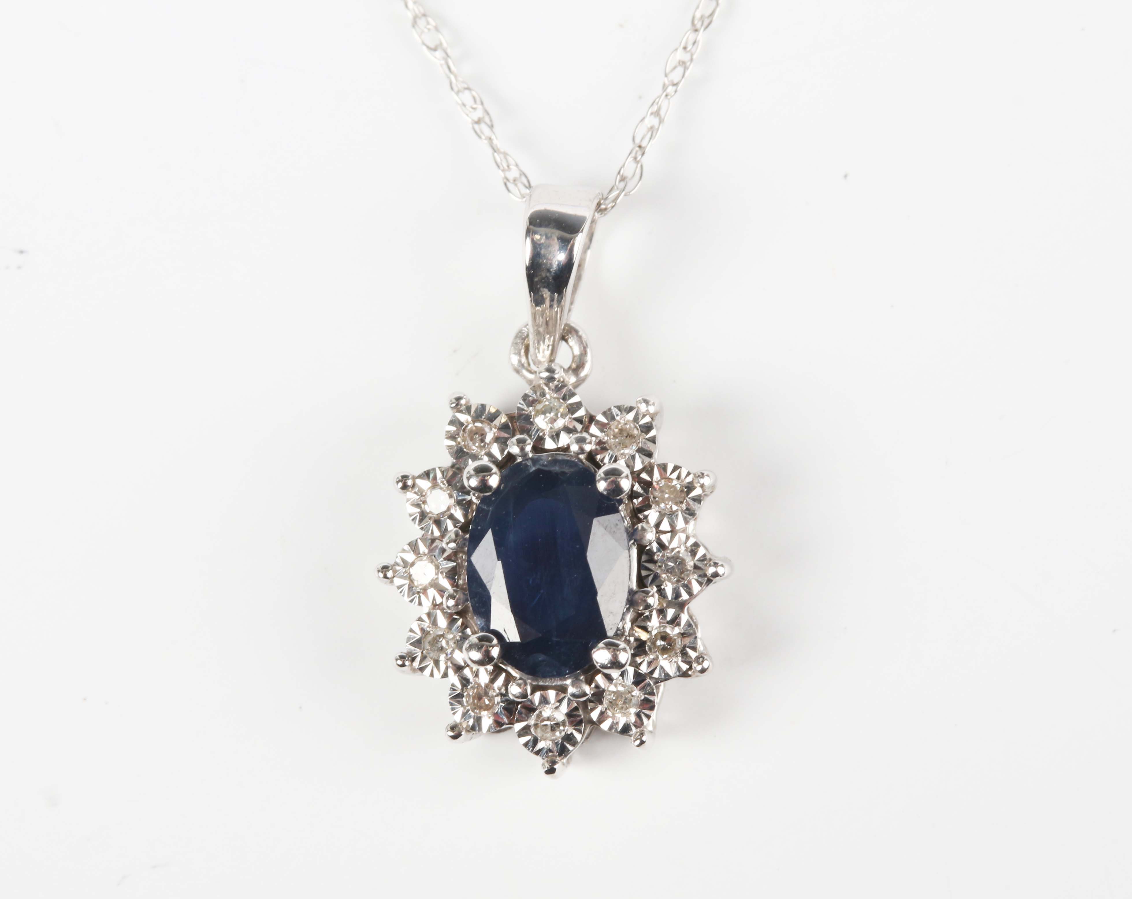 A white gold, sapphire and diamond oval cluster pendant, claw set with the oval cut sapphire within a surround of circular cut diamonds, detailed ‘10K’, length 1.8cm, with a white gold neckchain on a boltring clasp, detailed ‘10KT’, length 45.2cm, total weight 1.7g.