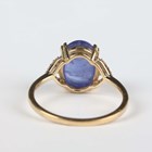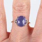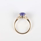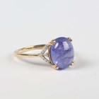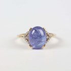 A 9ct gold ring, collet set with an oval cabochon tanzanite between diamond set shoulders, weight 2.8g, ring size approx P.