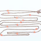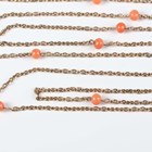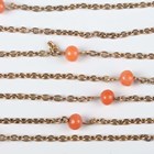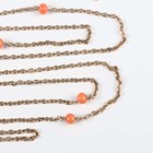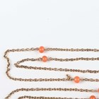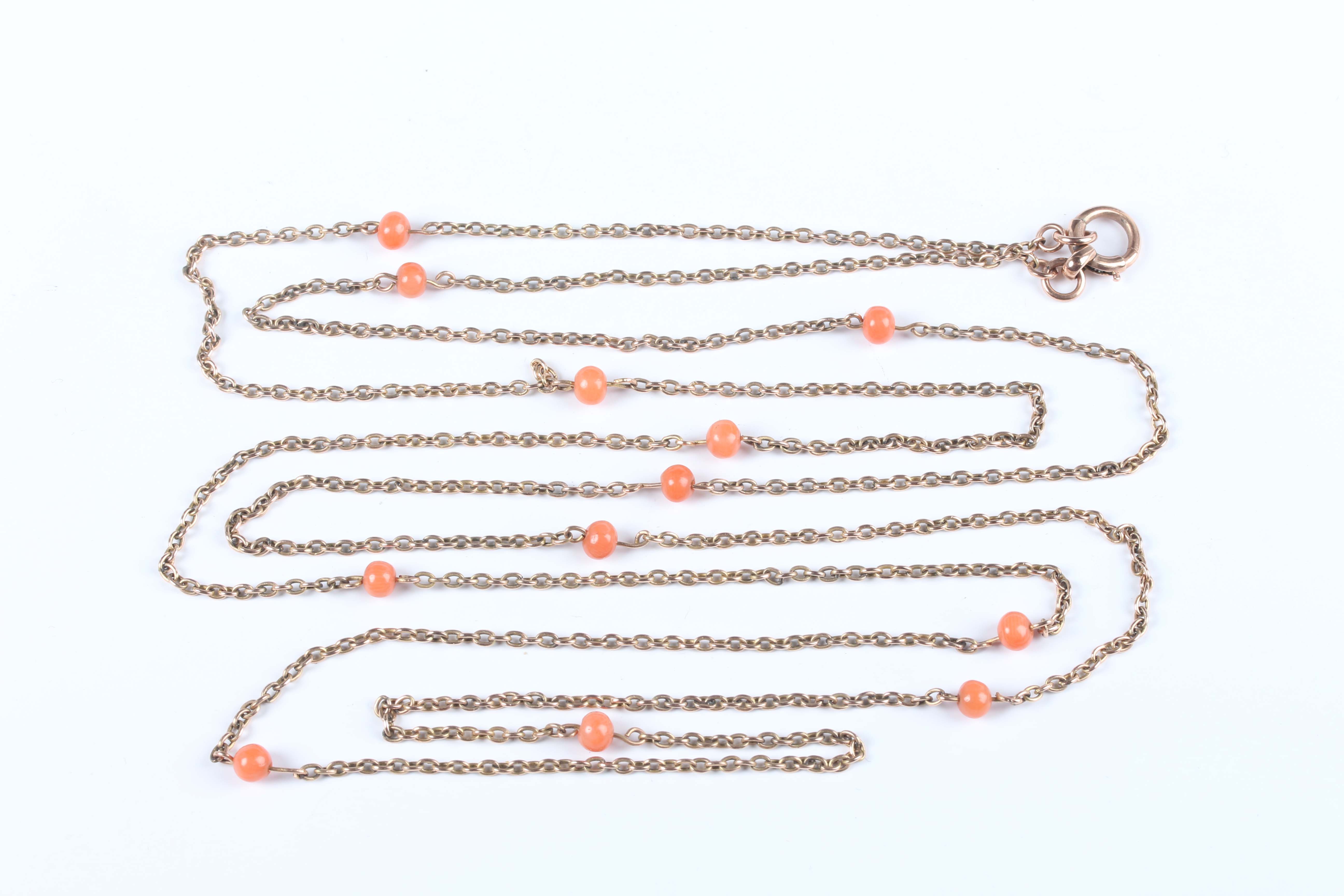 A gold long oval link neckchain, mounted with coral beads at intervals, on a gold boltring clasp, detailed ‘9’, weight 14.3g, length 134cm, with an associated case.
