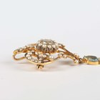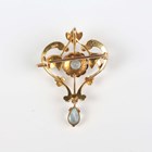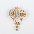 An Edwardian gold, aquamarine and seed pearl pendant brooch in a foliate openwork design, the front mounted with a pear shaped aquamarine drop, detailed ‘9ct’, weight 4.6g, width 2.7cm, with an associated case.