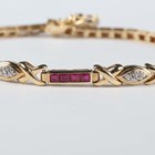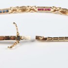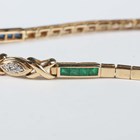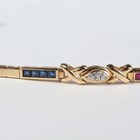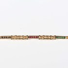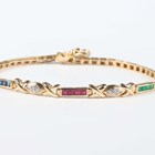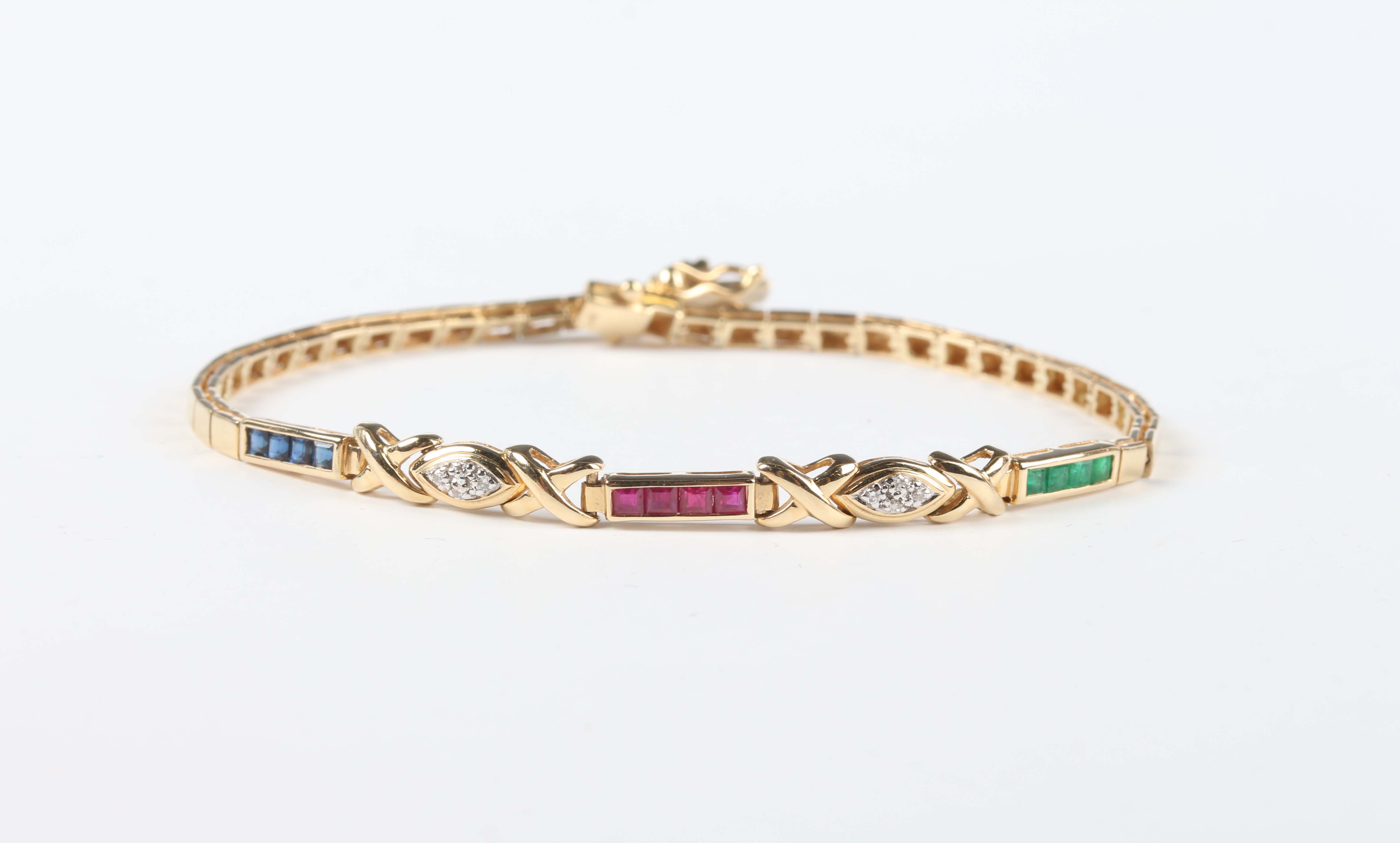 A gold, diamond, emerald, ruby and sapphire bracelet on a snap clasp, detailed ‘14K’, weight 7.2g, length 18.2cm.