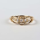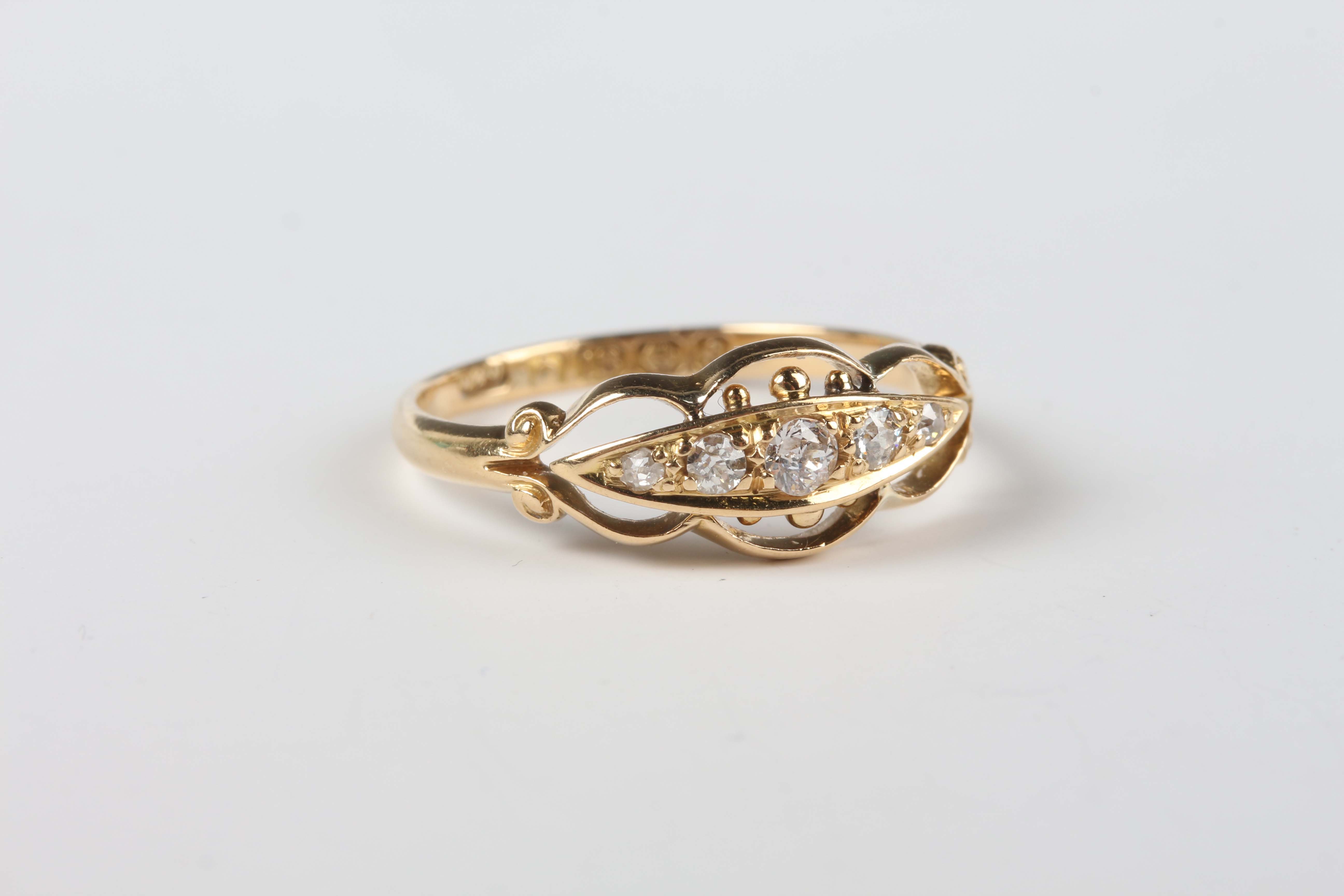 An Edwardian 18ct gold and diamond five stone ring, mounted with a row of graduated old cut cushion shaped diamonds between beaded openwork sides, Birmingham 1905, ring size approx L.