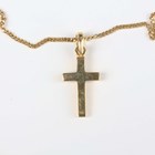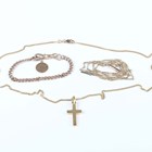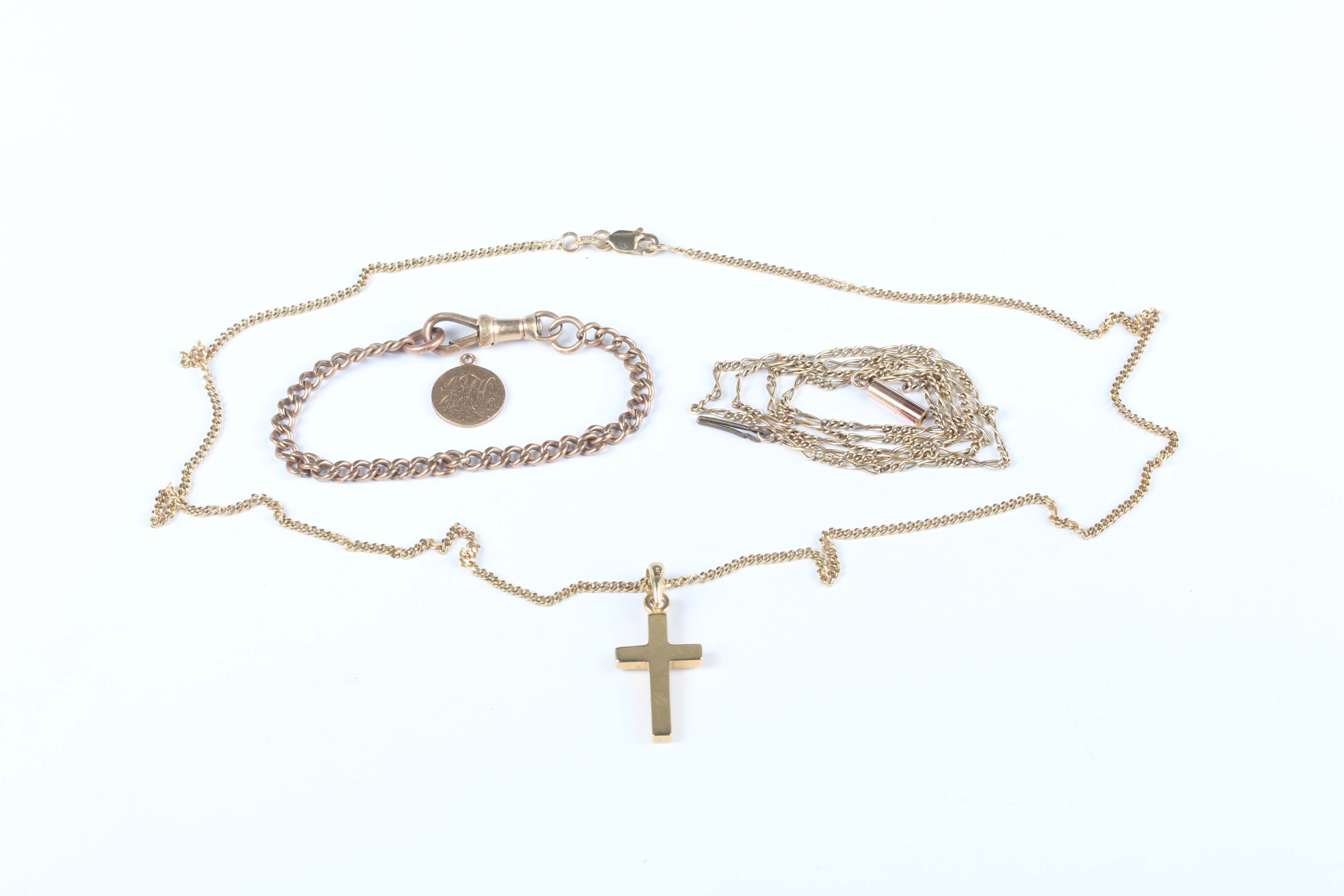 A 9ct gold pendant cross, length 2.9cm, with a 9ct gold curblink neckchain on a sprung hook shaped clasp, length 45.5cm, a gold circular charm, detailed ‘9c’, total weight 6.4g, a gold bracelet, fitted with a swivel, weight 4.7g, and a gold Figaro link neckchain, unmarked, weight 2.7g.
