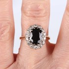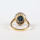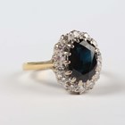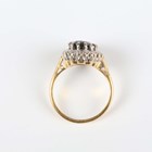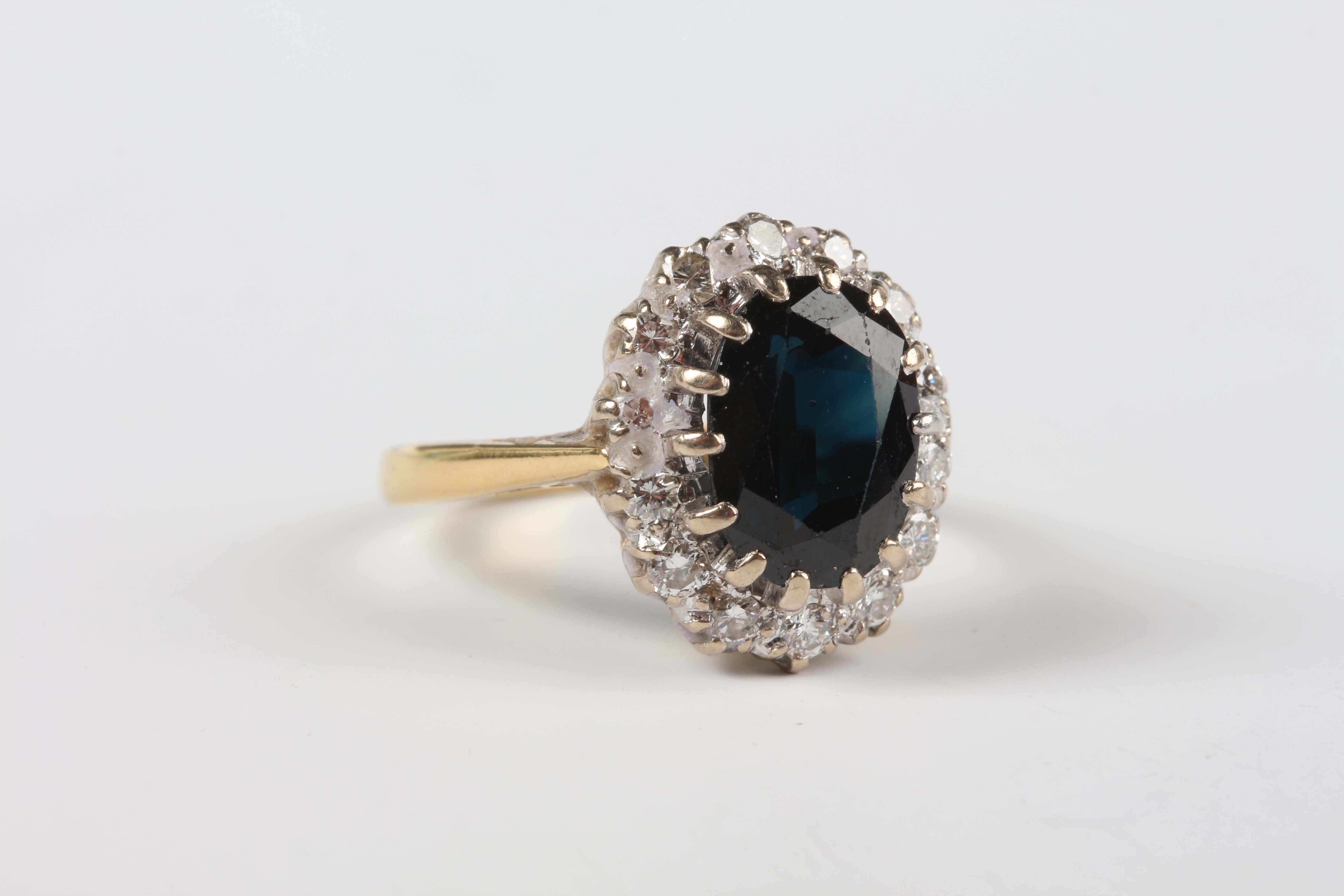 A gold, platinum, sapphire and diamond oval cluster ring, claw set with the oval cut sapphire within a surround of circular cut diamonds, detailed ‘18ct Plat’, ring size approx M1/2.