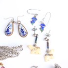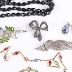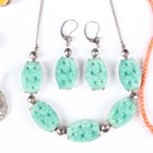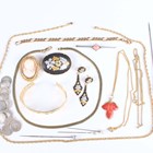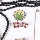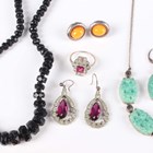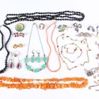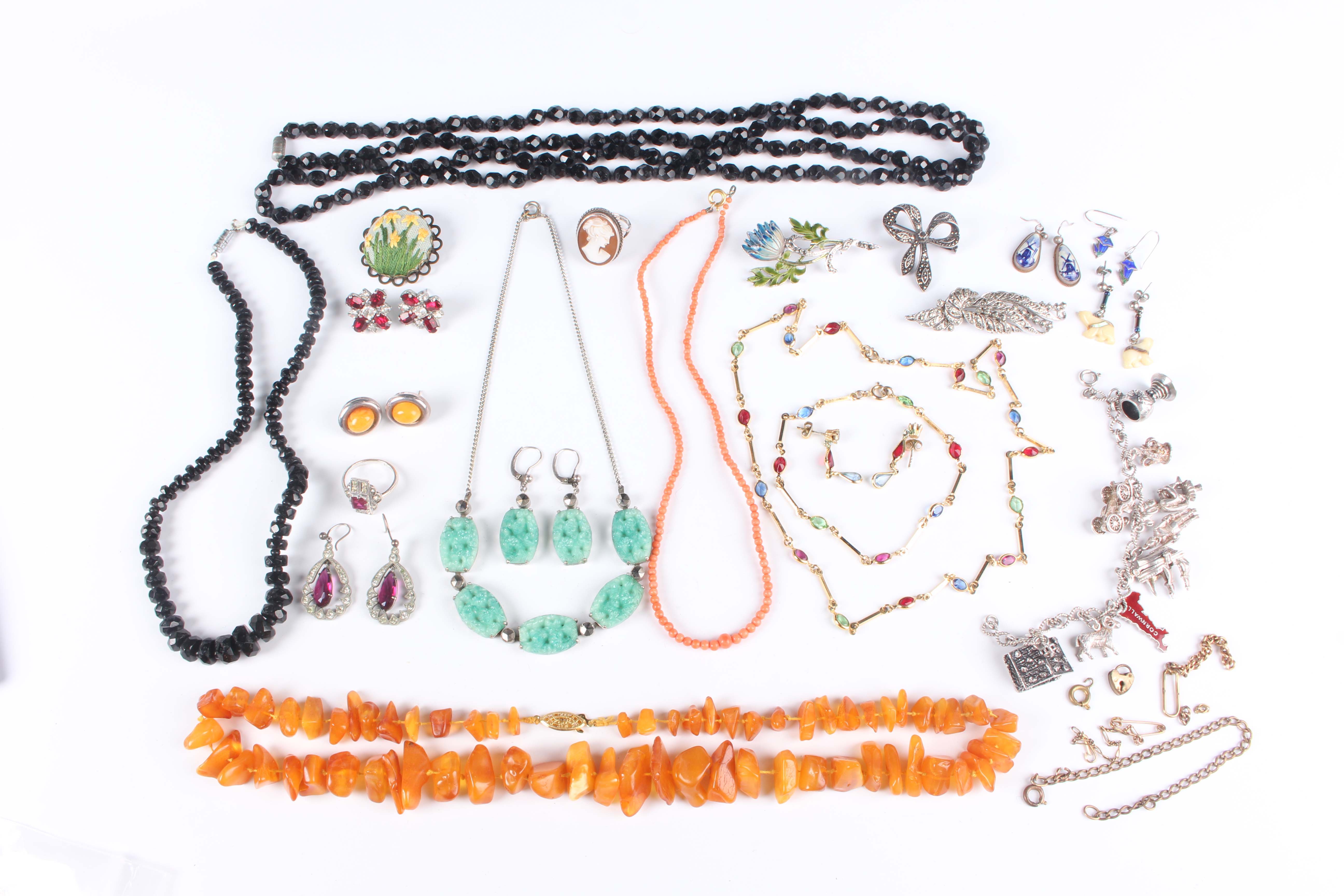 A group of costume jewellery, including a pair of colourless and pink paste set earrings with a matching Art Deco style ring, a suite of varicoloured paste set jewellery, comprising a necklace, a bracelet and a pair of earrings, a green paste imitating jade necklace with a matching pair of earrings, a coral bead necklace and a charm bracelet.