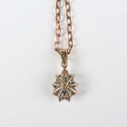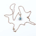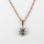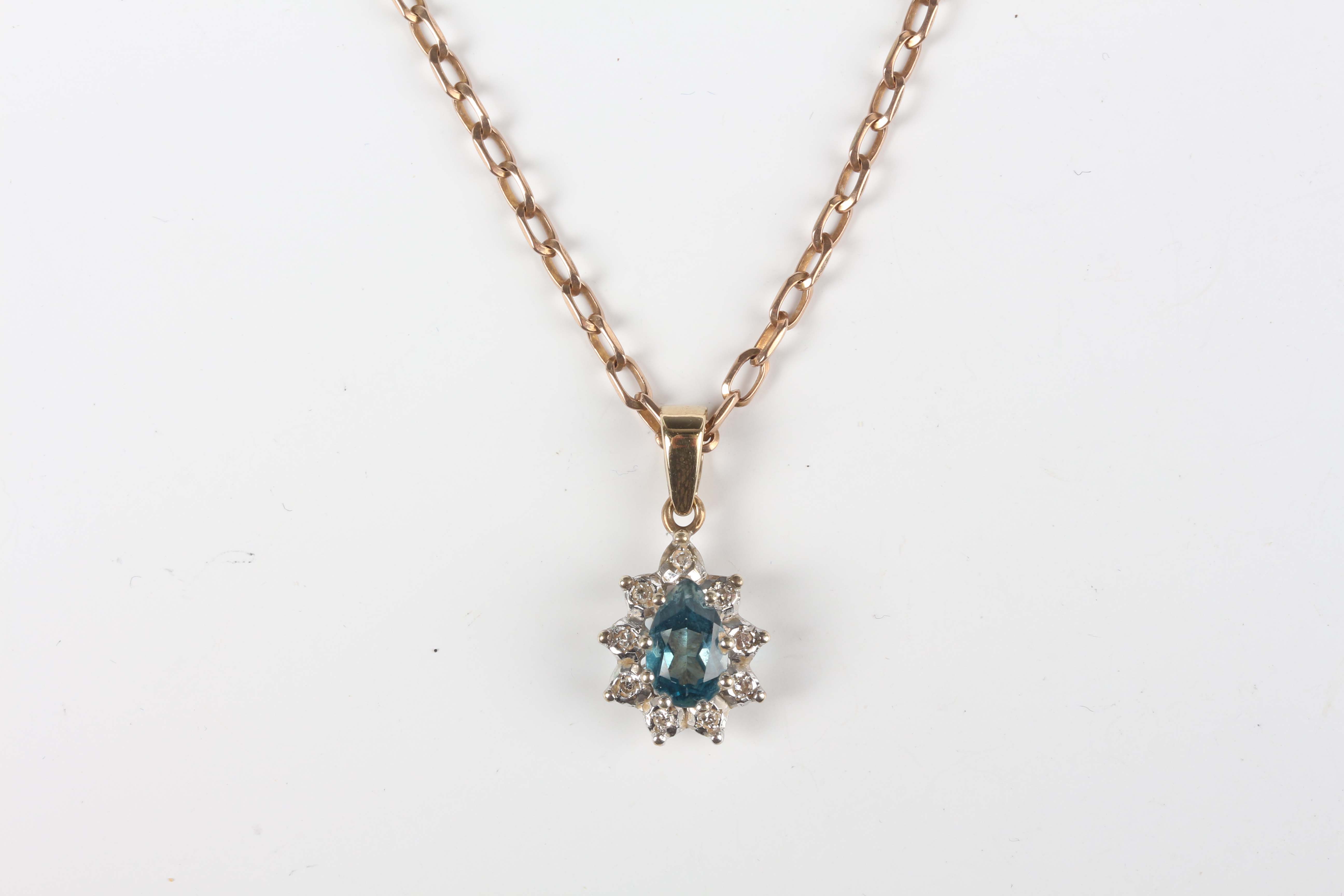 A 9ct gold, blue topaz and colourless gem set pendant, claw set with a pear shaped blue topaz within a surround of colourless gemstones, length 2cm, with a 9ct gold curblink neckchain on a boltring clasp, length 48.5cm, total weight 6.1g.