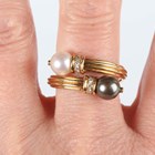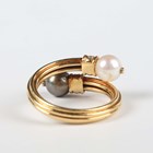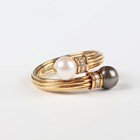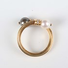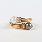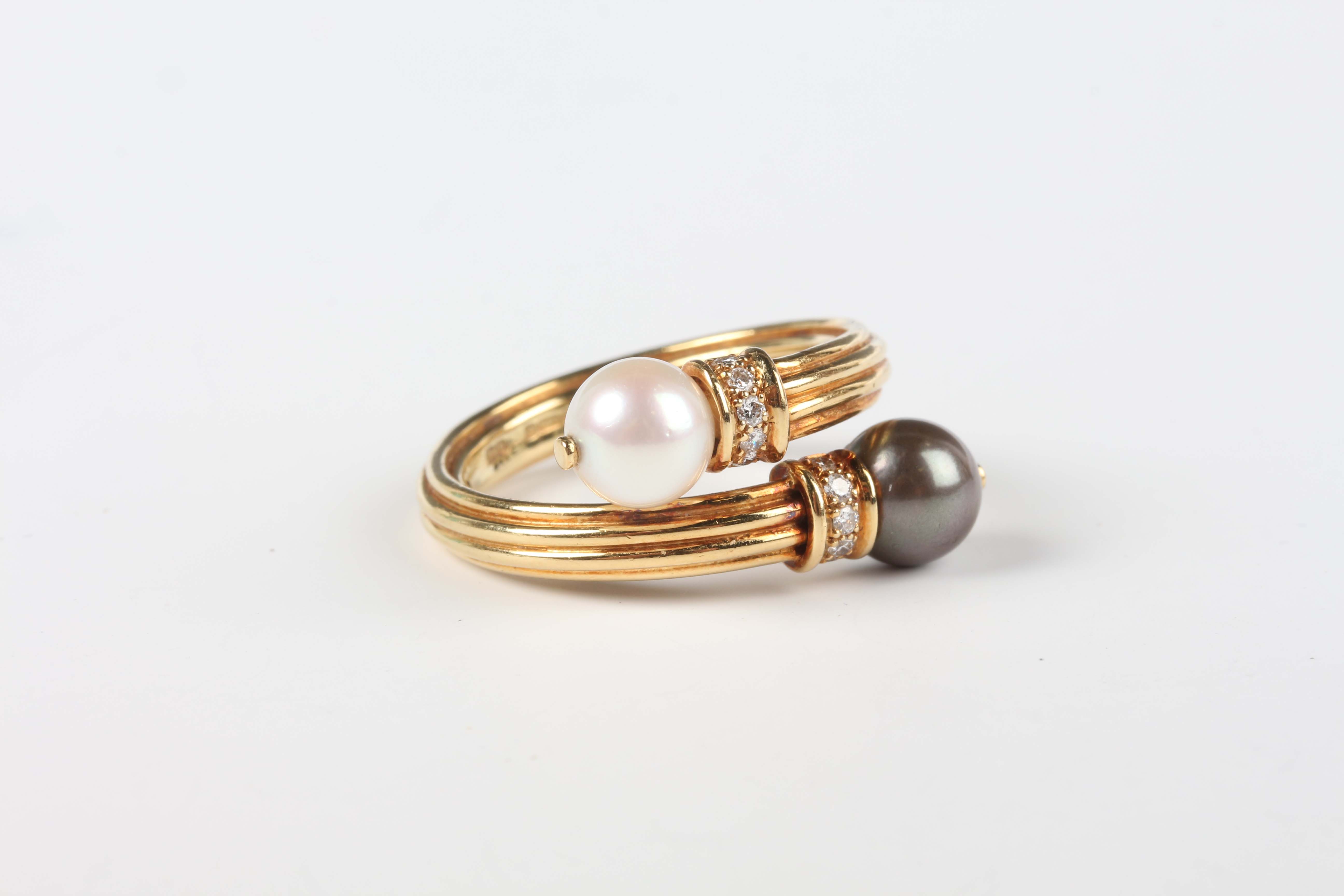 A Boodles & Dunthorne 18ct gold, diamond and cultured pearl ring in a ridged crossover design, mounted with a grey tinted cultured pearl and a white cultured pearl, otherwise with diamond set collars, London 1998, weight 8.2g, ring size approx P1/2.