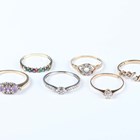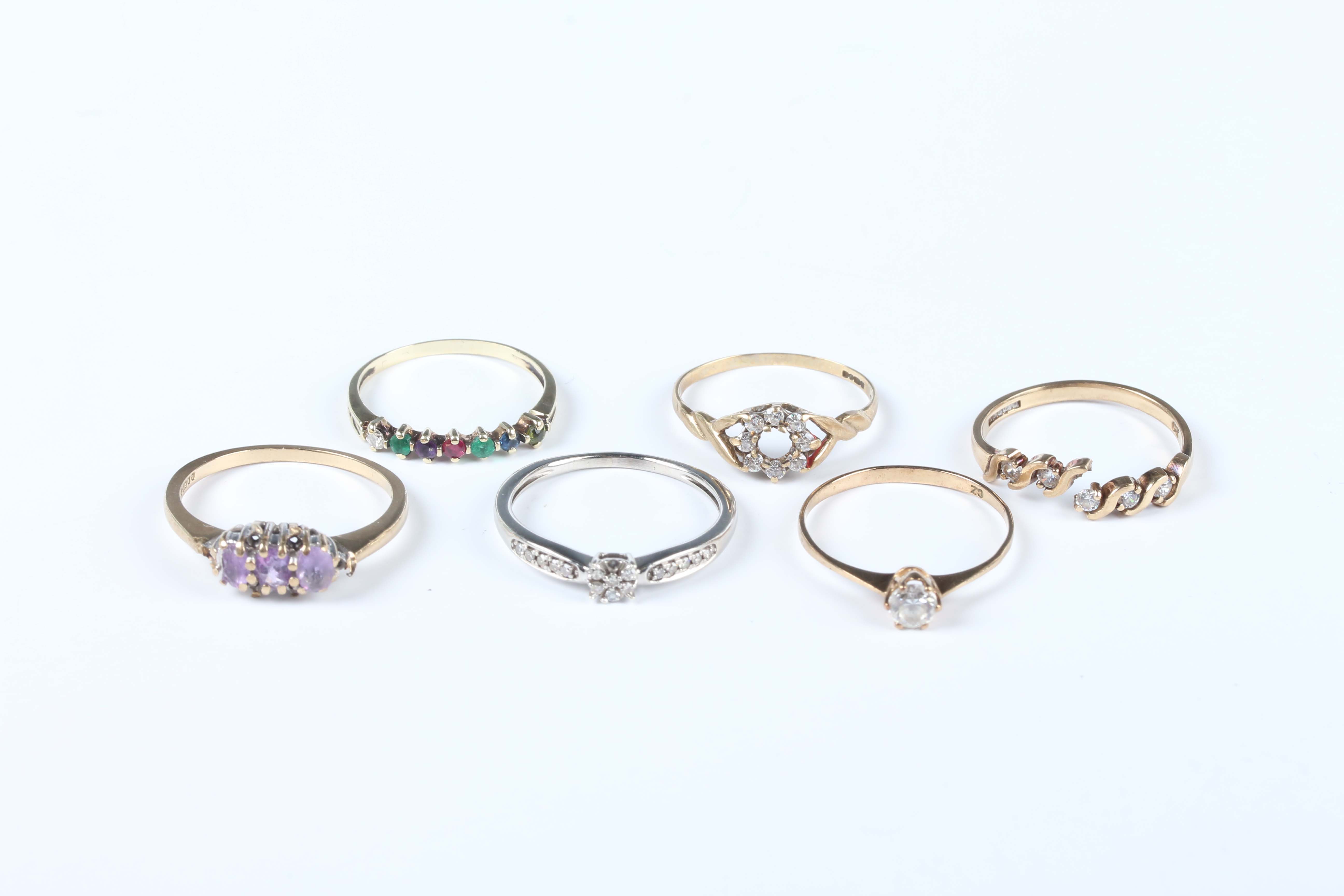 A gold and gemstone set ‘Dearest’ ring, marks rubbed, weight 0.9g, ring size approx K, a 9ct gold and amethyst ring, three 9ct gold and colourless gem set rings, total weight 5.1g, and another colourless gem set ring.