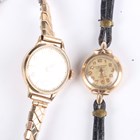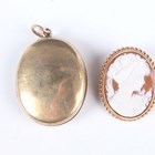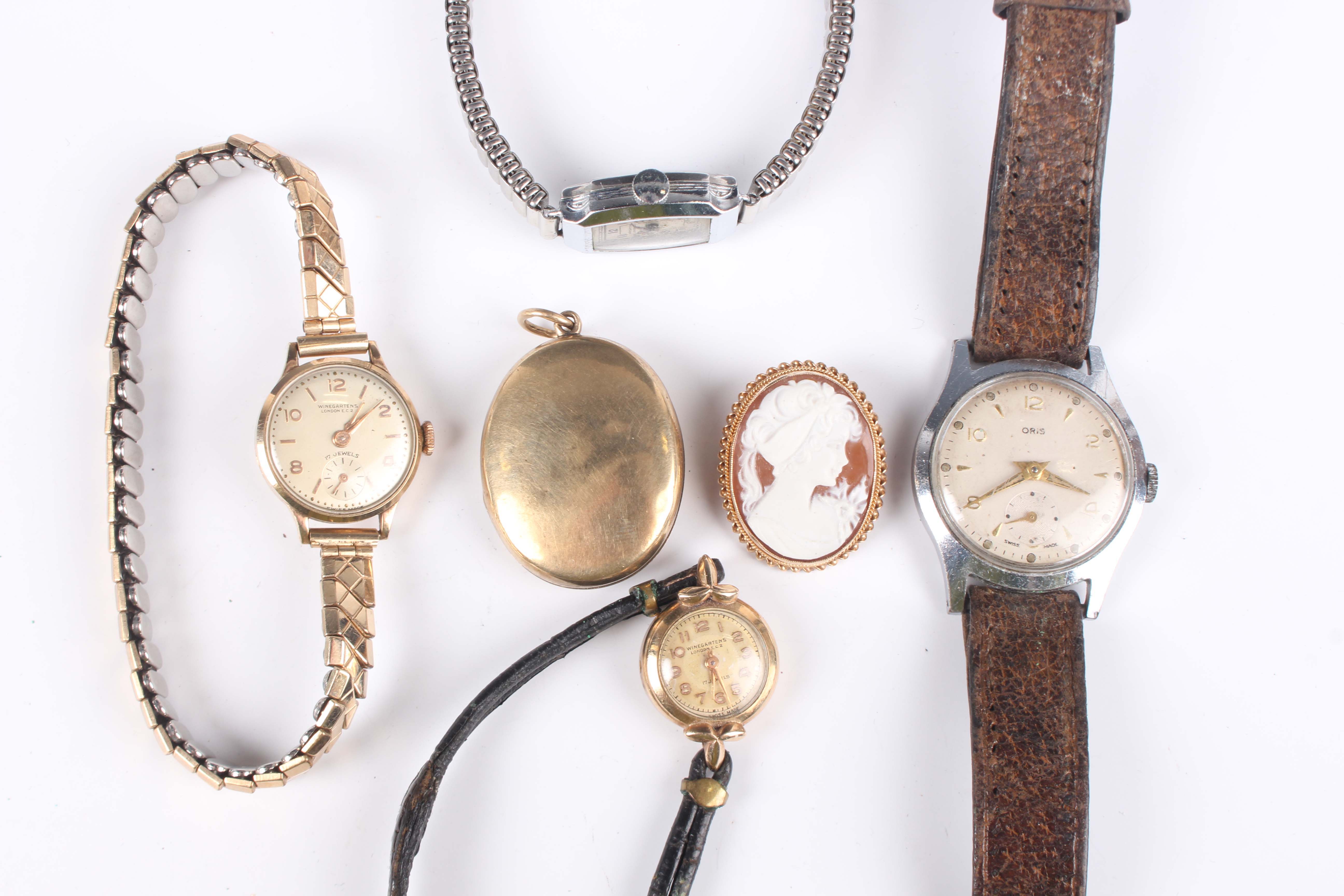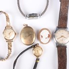A 9ct gold mounted oval shell cameo brooch, carved as a portrait of a lady, weight 4.3g, width 2.2cm, a gilt metal oval pendant locket, two gold cased ladies' wristwatches and two further wristwatches.