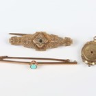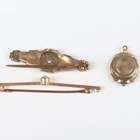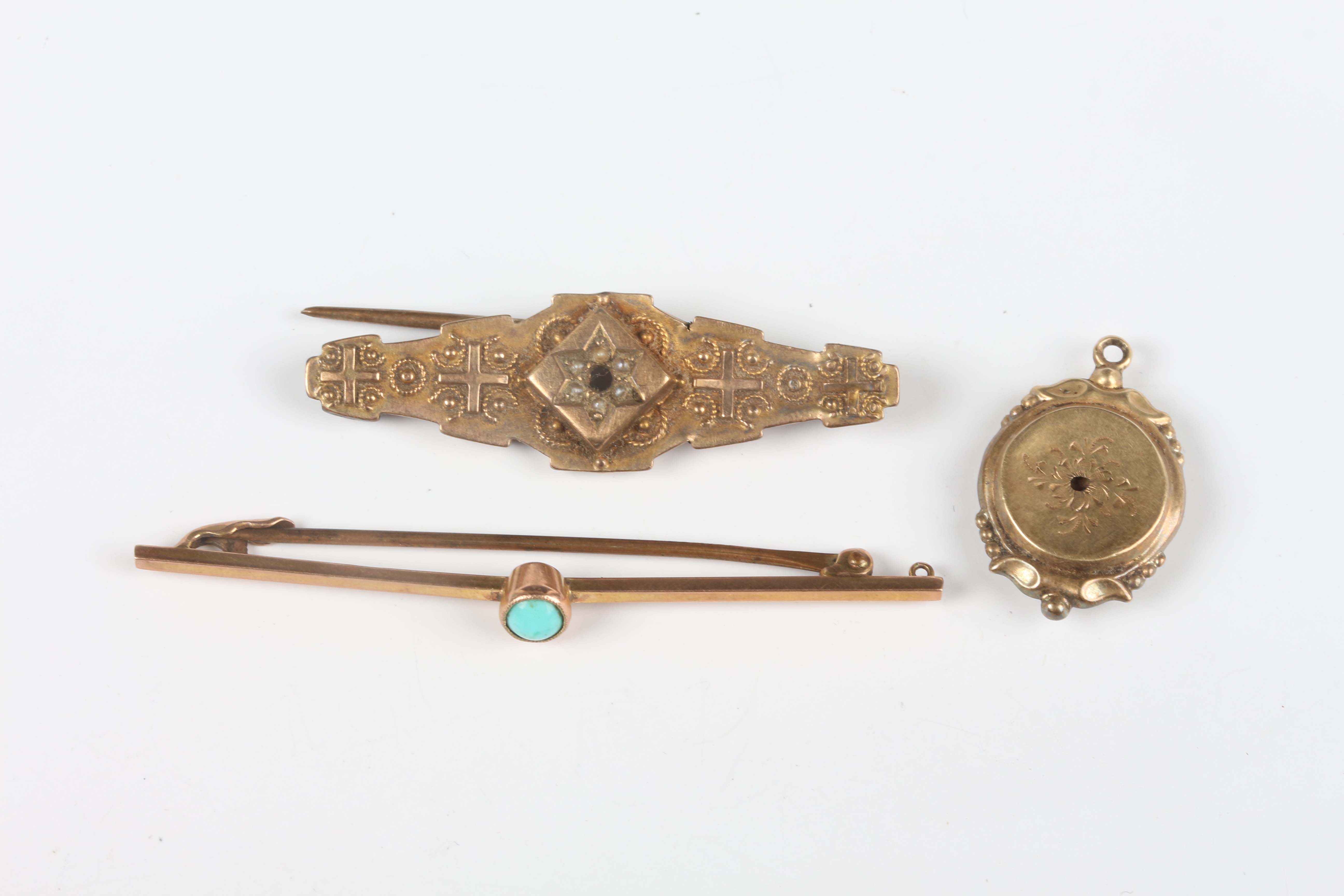 A late Victorian 9ct gold and seed pearl brooch, Chester 1896, weight 1.7g, width 3.7cm (central gemstone lacking), a gold and turquoise single stone bar brooch, unmarked, weight 1.3g, and a circular pendant, the back glazed with a locket compartment.