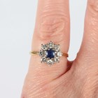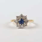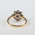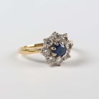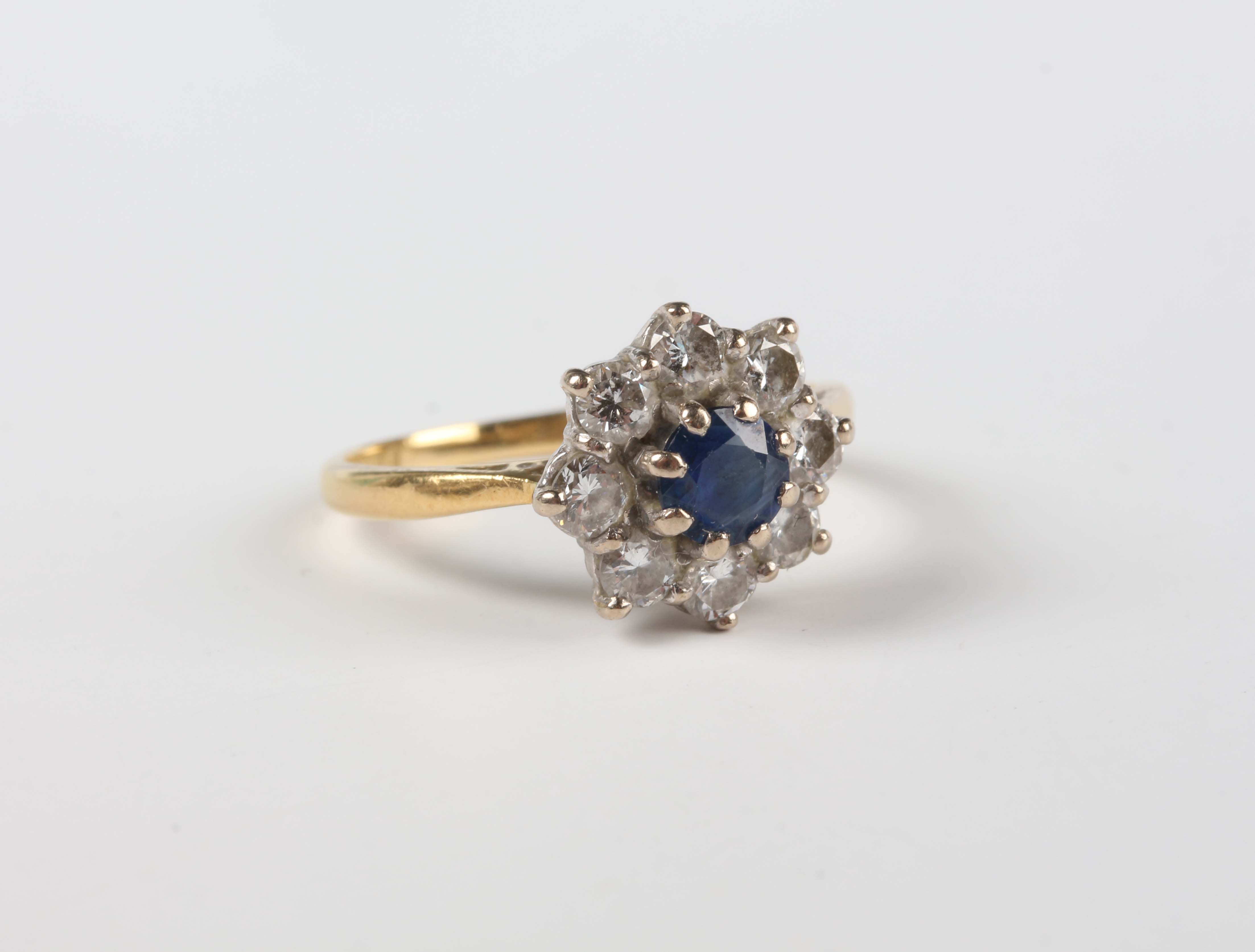 An 18ct gold, sapphire and diamond cluster ring, claw set with the circular cut sapphire within a surround of eight circular cut diamonds, Sheffield 1985, weight 2.7g, ring size approx I1/2, with a case.