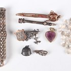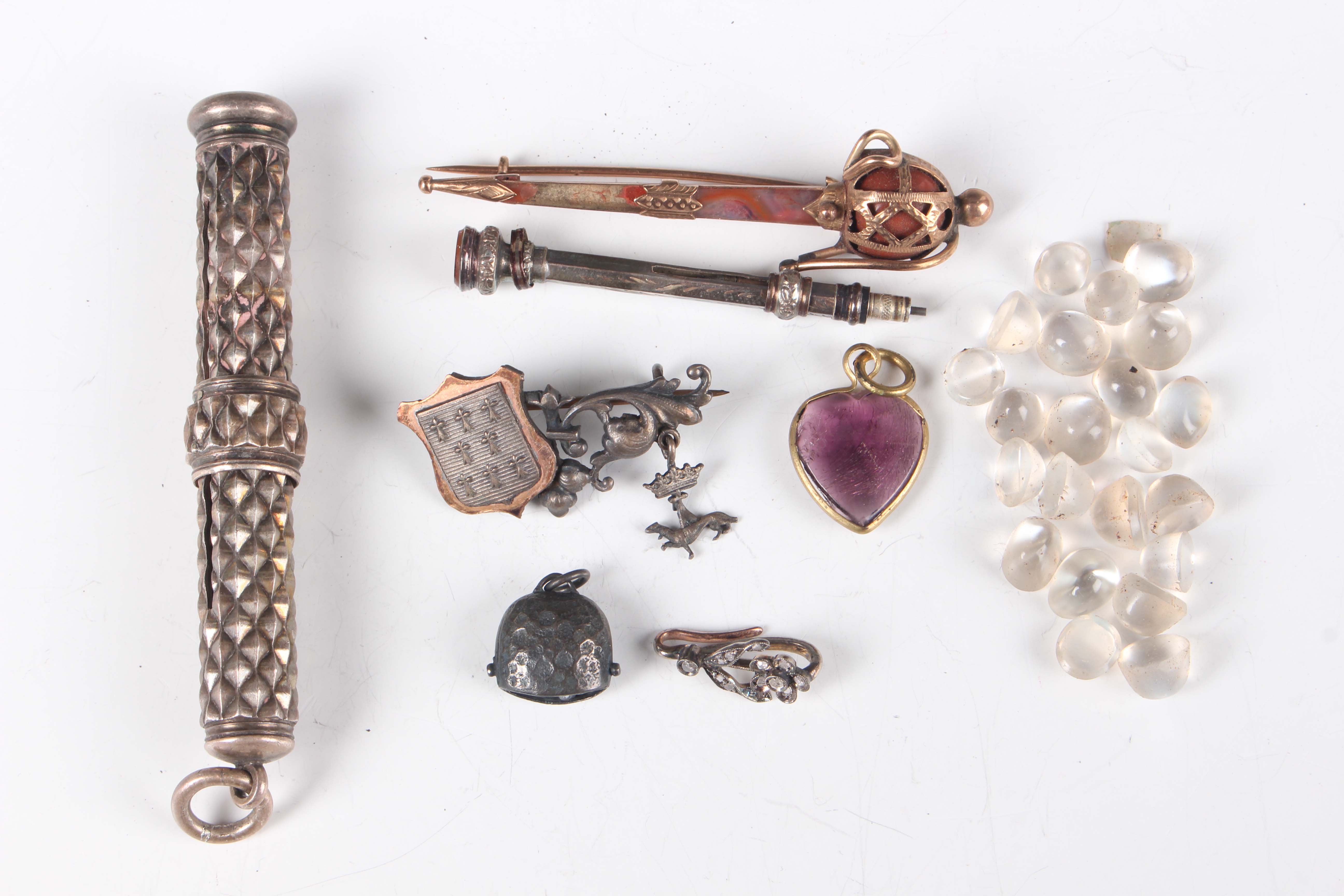 A small group of jewellery, including two silver propelling pencils, one detailed ‘S. Mordan & Co’, a silver and diamond surmount, designed as a flower, a set of prayer beads and a selection of unmounted moonstones, with four jewellery cases.