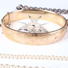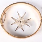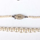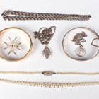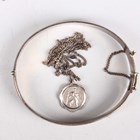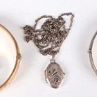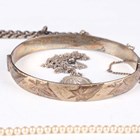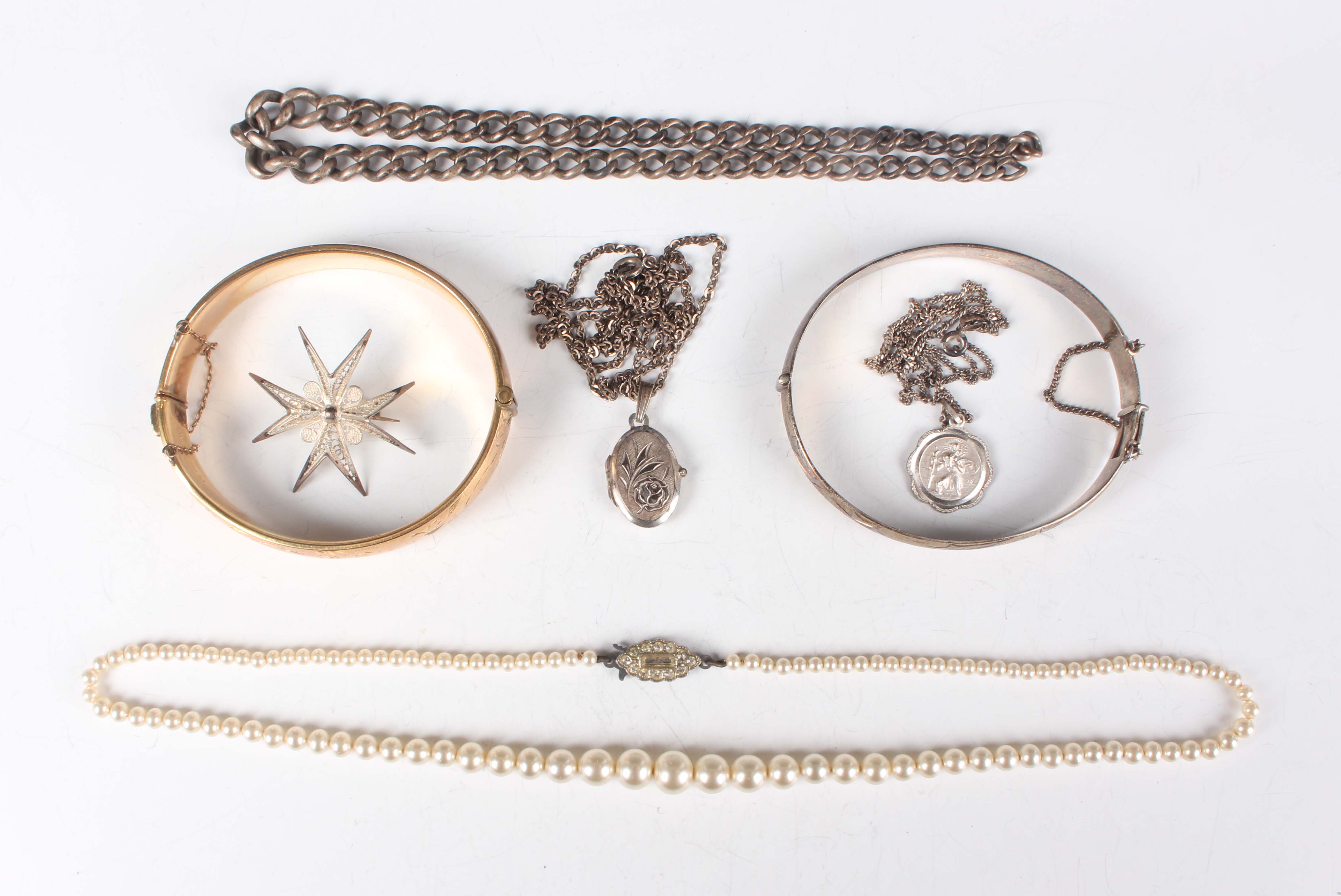 A group of jewellery, comprising a gilt metal oval hinged bangle, a silver oval hinged bangle, a silver curblink watch chain, two silver pendants with neckchains, total weight 64.4g, a filigree Maltese cross brooch and a single row necklace of imitation pearls on a silver and colourless paste clasp, with a case.