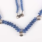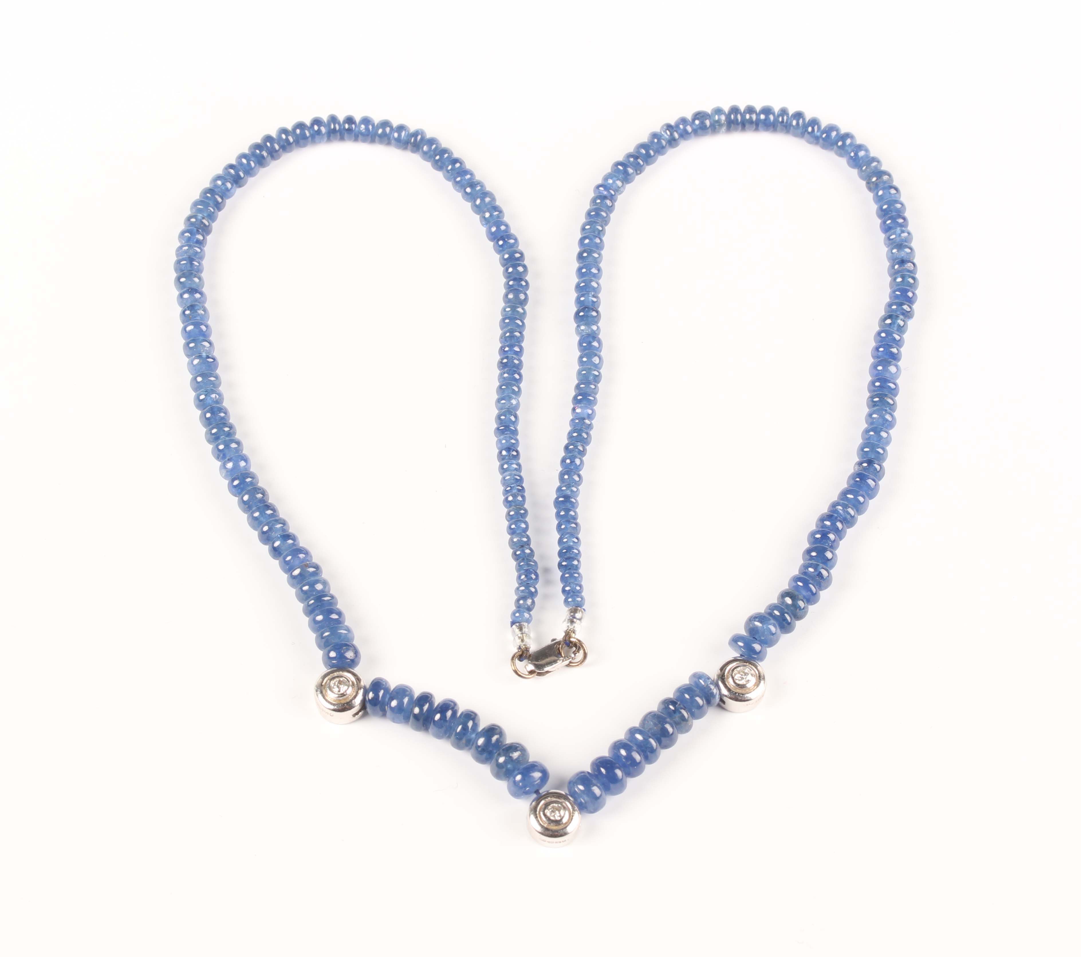 A single row necklace of graduated sapphire beads, the front with three 9ct white gold and diamond single stone divisions, mounted with circular cut diamonds, on a white gold sprung hook shaped clasp, length 47cm.