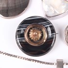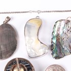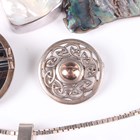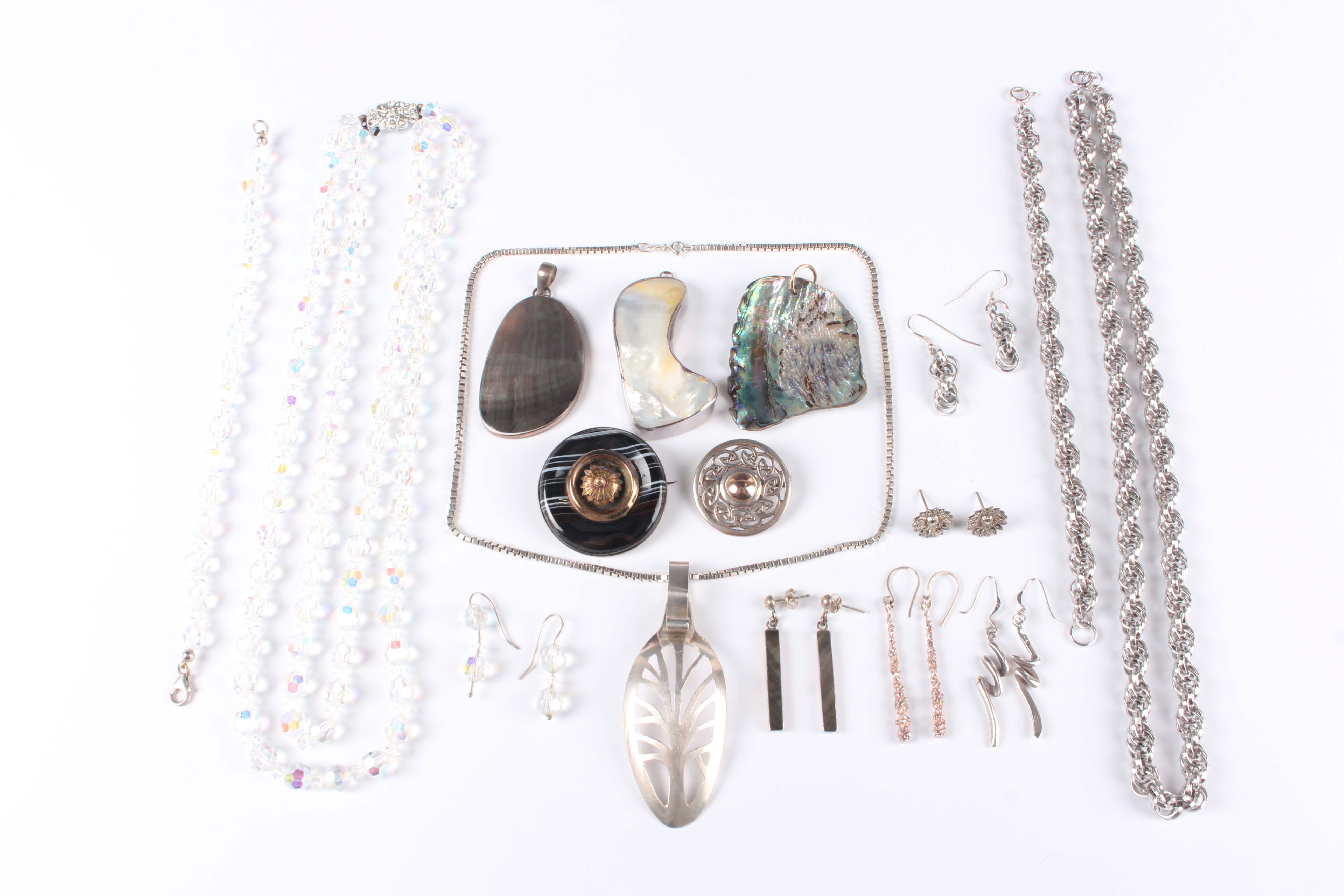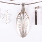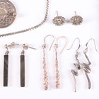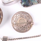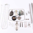 A group of silver jewellery, comprising a ropetwist link neckchain, length 52.5cm, with a matching bracelet and pair of earrings, a Celtic style circular brooch, a box link neckchain, a spoon converted to a pendant, and two pairs of earrings, total weight 104.6g, together with a group of silver mounted and other jewellery, including a banded agate circular brooch.