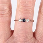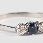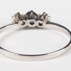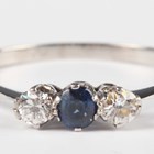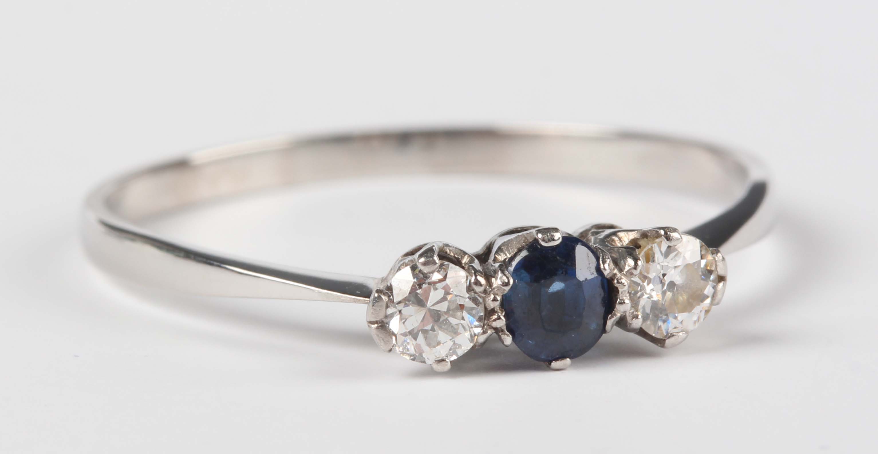 A platinum, sapphire and diamond ring, claw set with an oval cut sapphire between two circular cut diamonds, indistinct mark, weight 1.9g, ring size approx R.