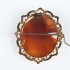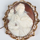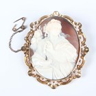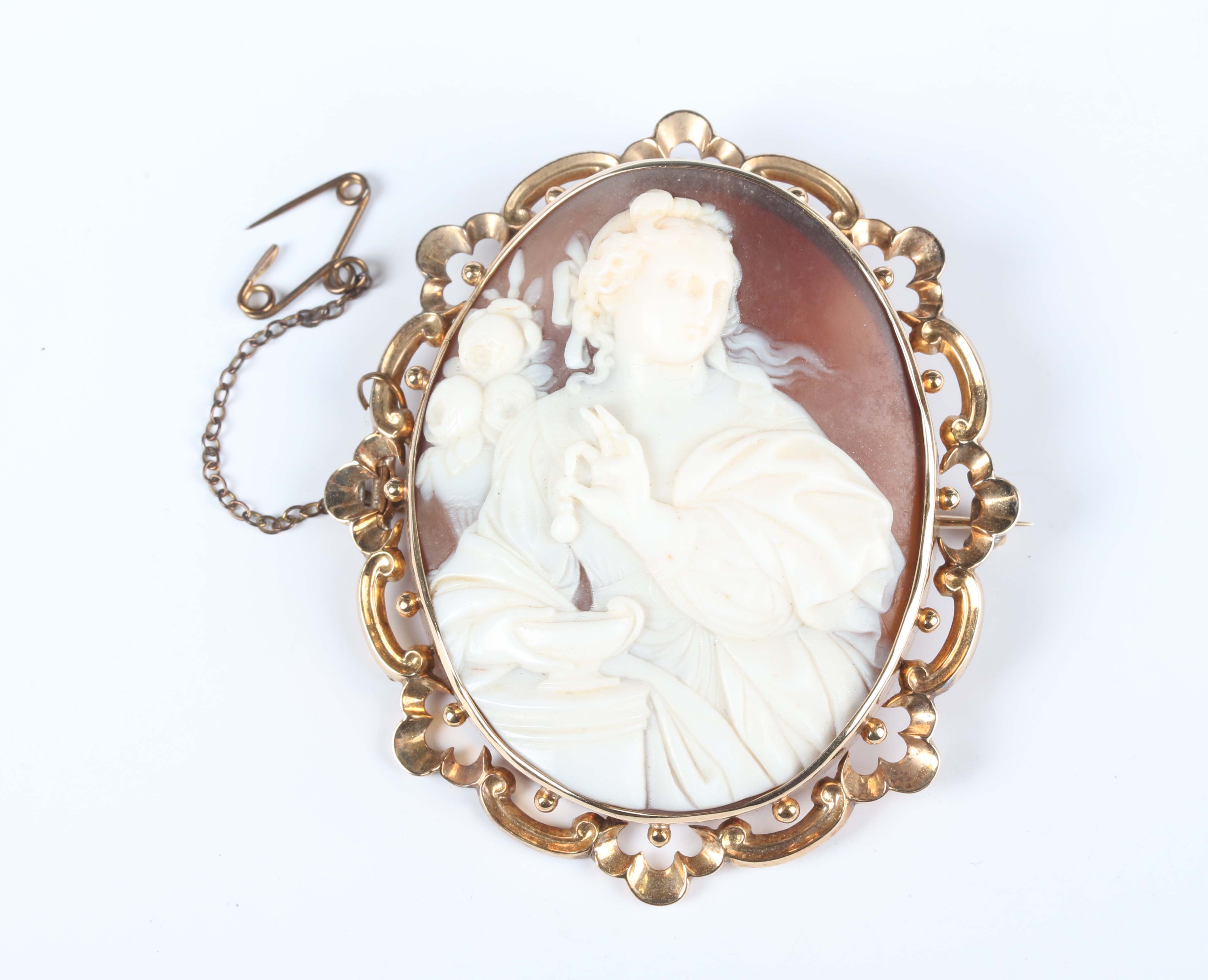 A Victorian gold mounted oval shell cameo brooch, carved as Cleopatra dissolving the pearl, unmarked, weight 17.2g, width 5.3cm, with a case.
