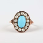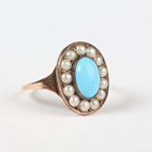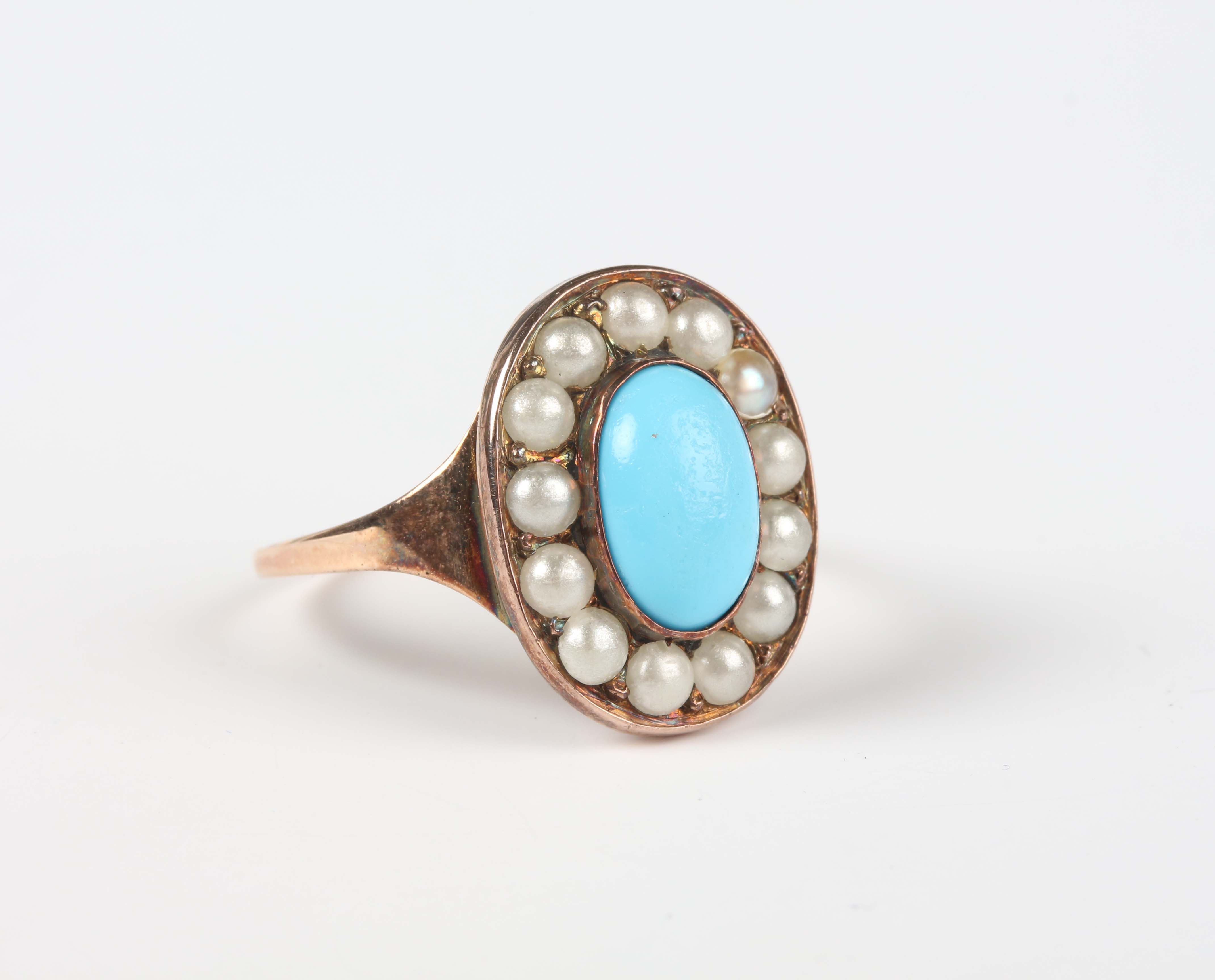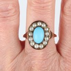 A Georgian gold, imitation turquoise and imitation pearl oval cluster ring, inscribed ‘Eliz Medhurst obt 31 Dec 1780 aet 22’, weight 4.3g, ring size approx T.