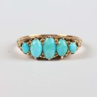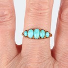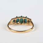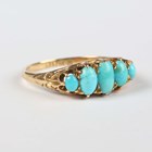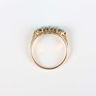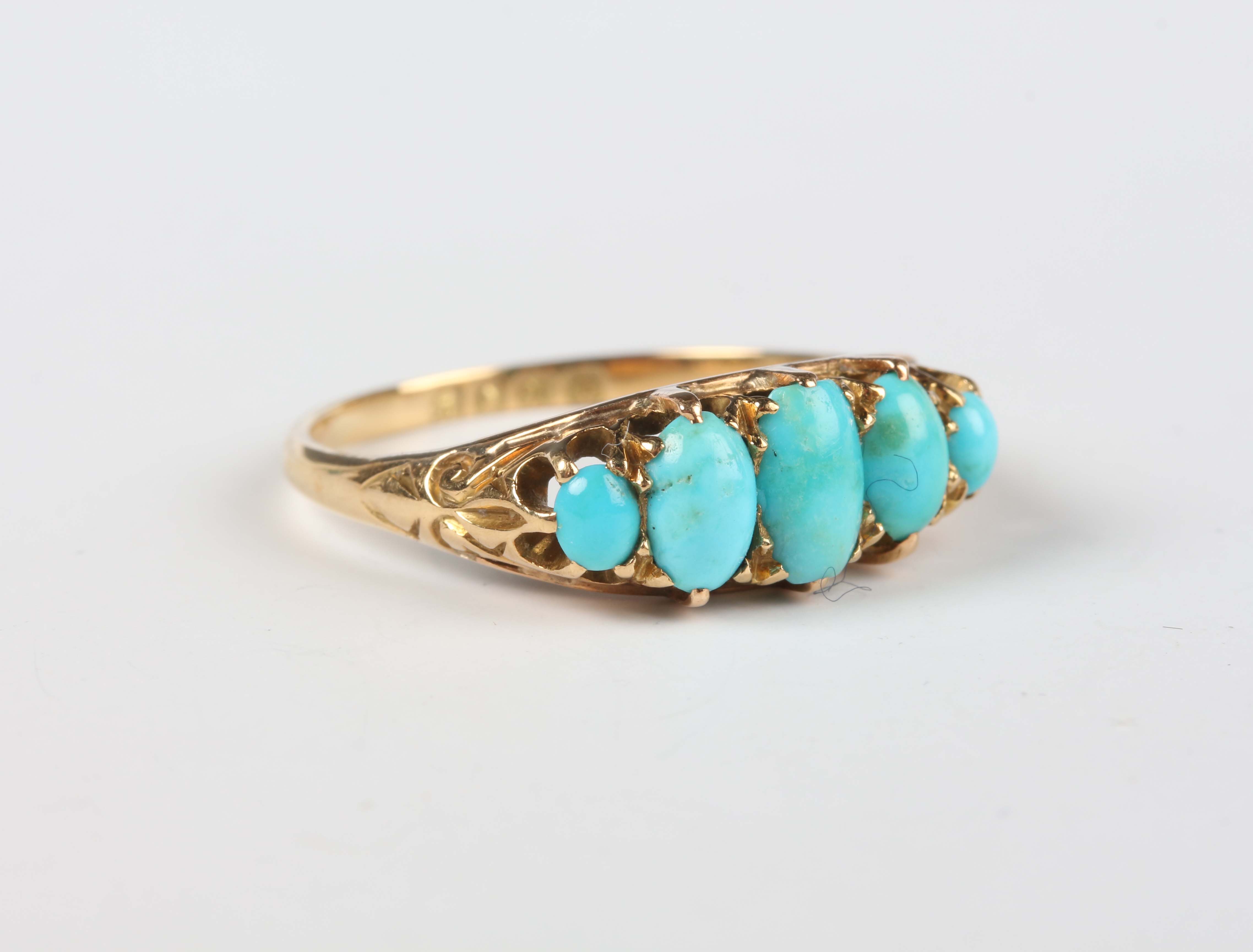 An Edwardian 18ct gold and turquoise five stone ring, claw set with a row of graduated oval turquoises, London 1902, weight 3.7g, ring size approx R.