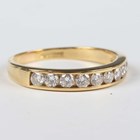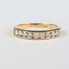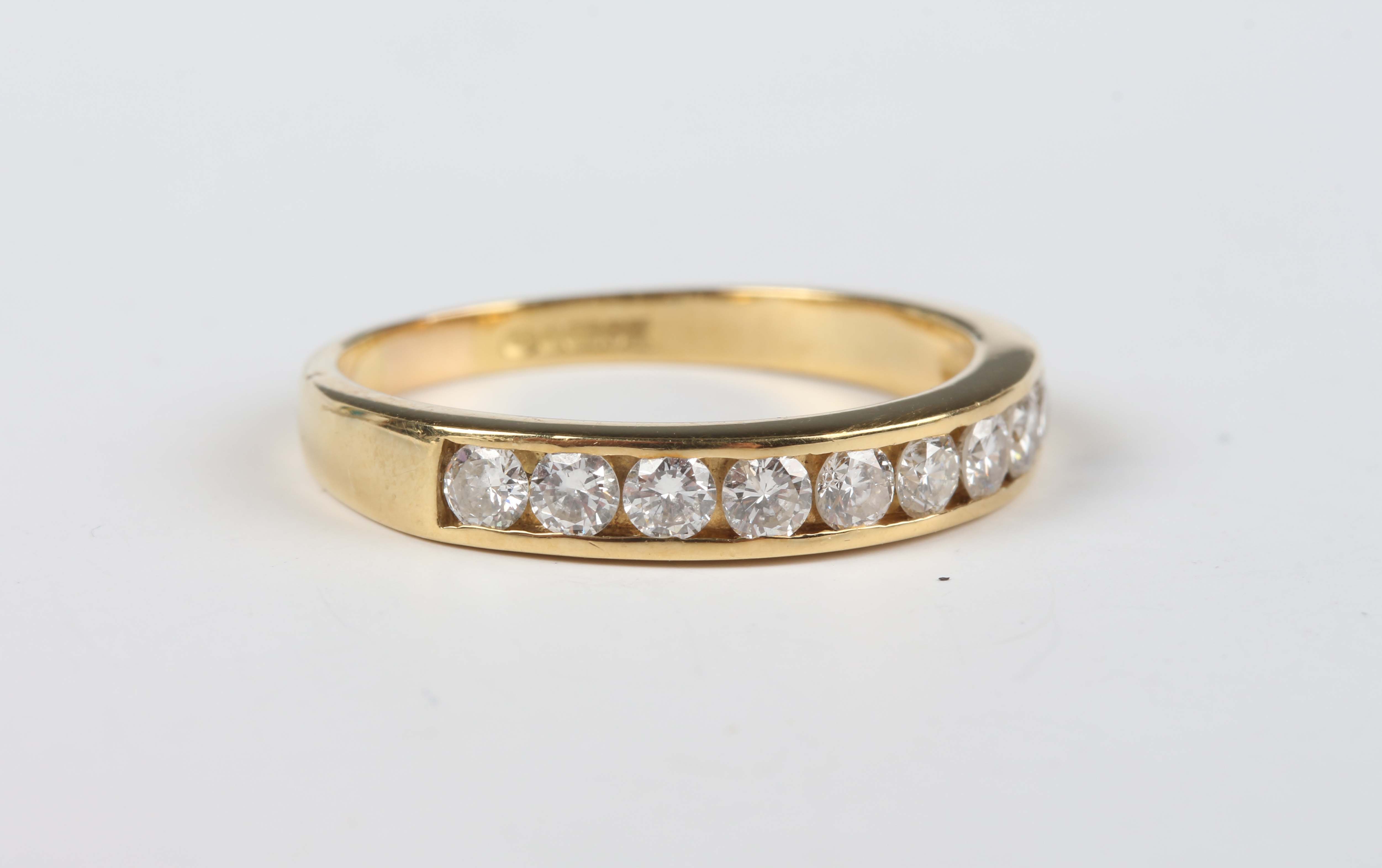 An 18ct gold and diamond ring, channel set with a row of nine circular cut diamonds, weight 4.2g, ring size approx S1/2.