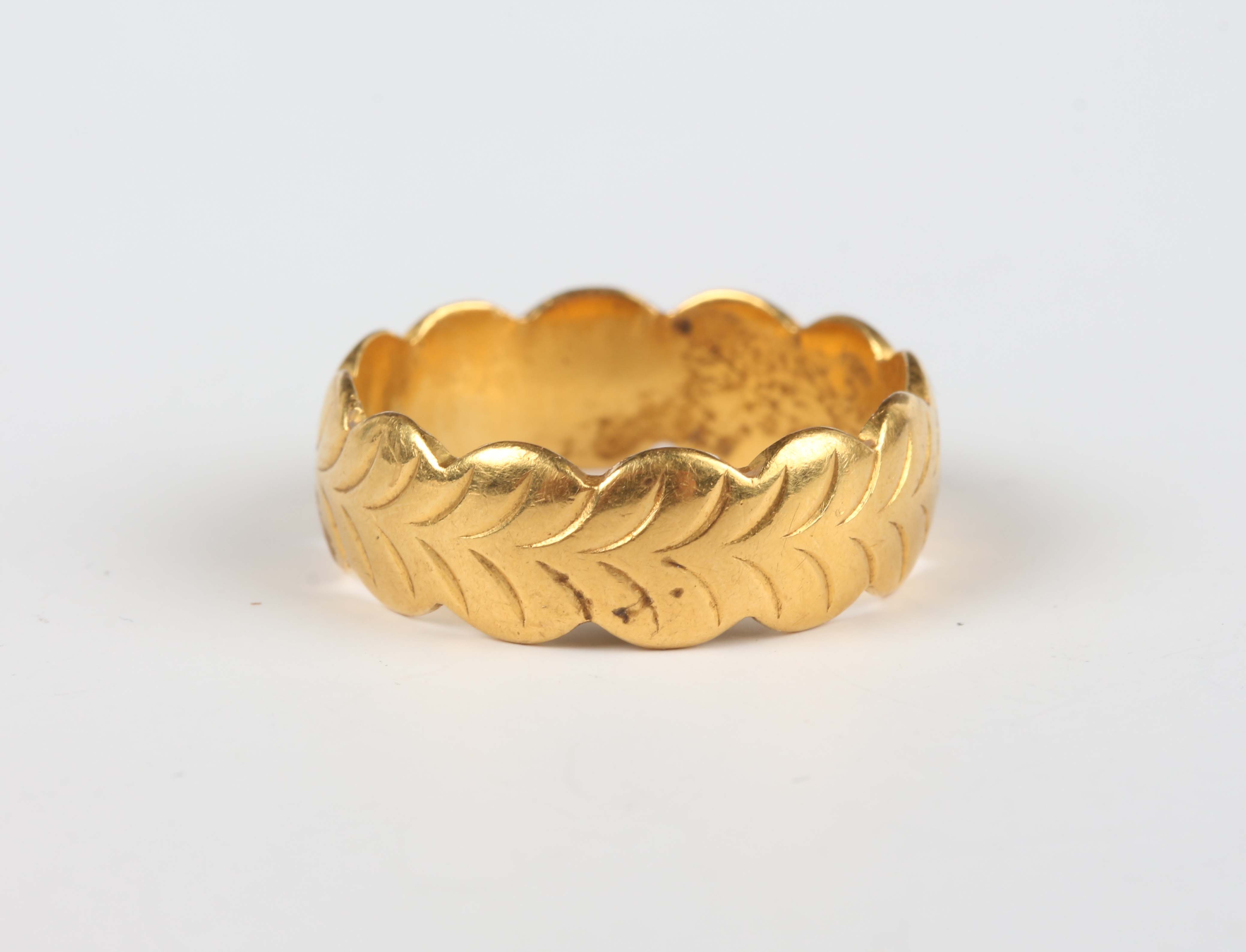 A 22ct gold decorated wedding ring, London 1972, weight 5.8g, ring size approx N1/2.