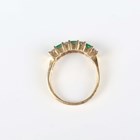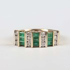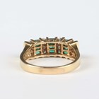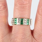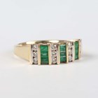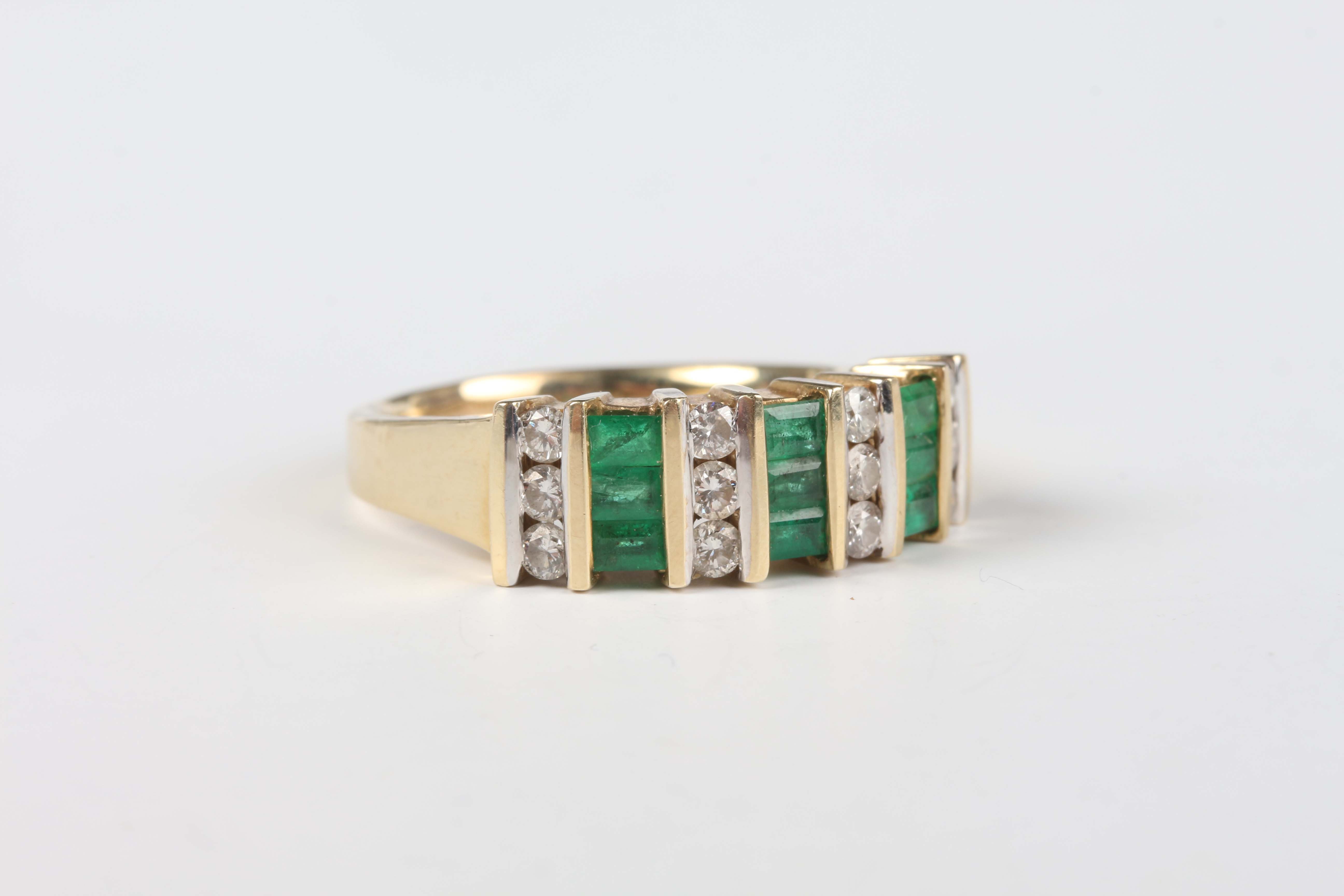 A gold, emerald and diamond ring, mounted with three rows of three baguette cut emeralds alternating with four rows of three circular cut diamonds, detailed ‘14K’, weight 6.9g, ring size approx S, with a case.