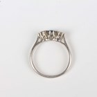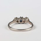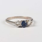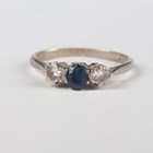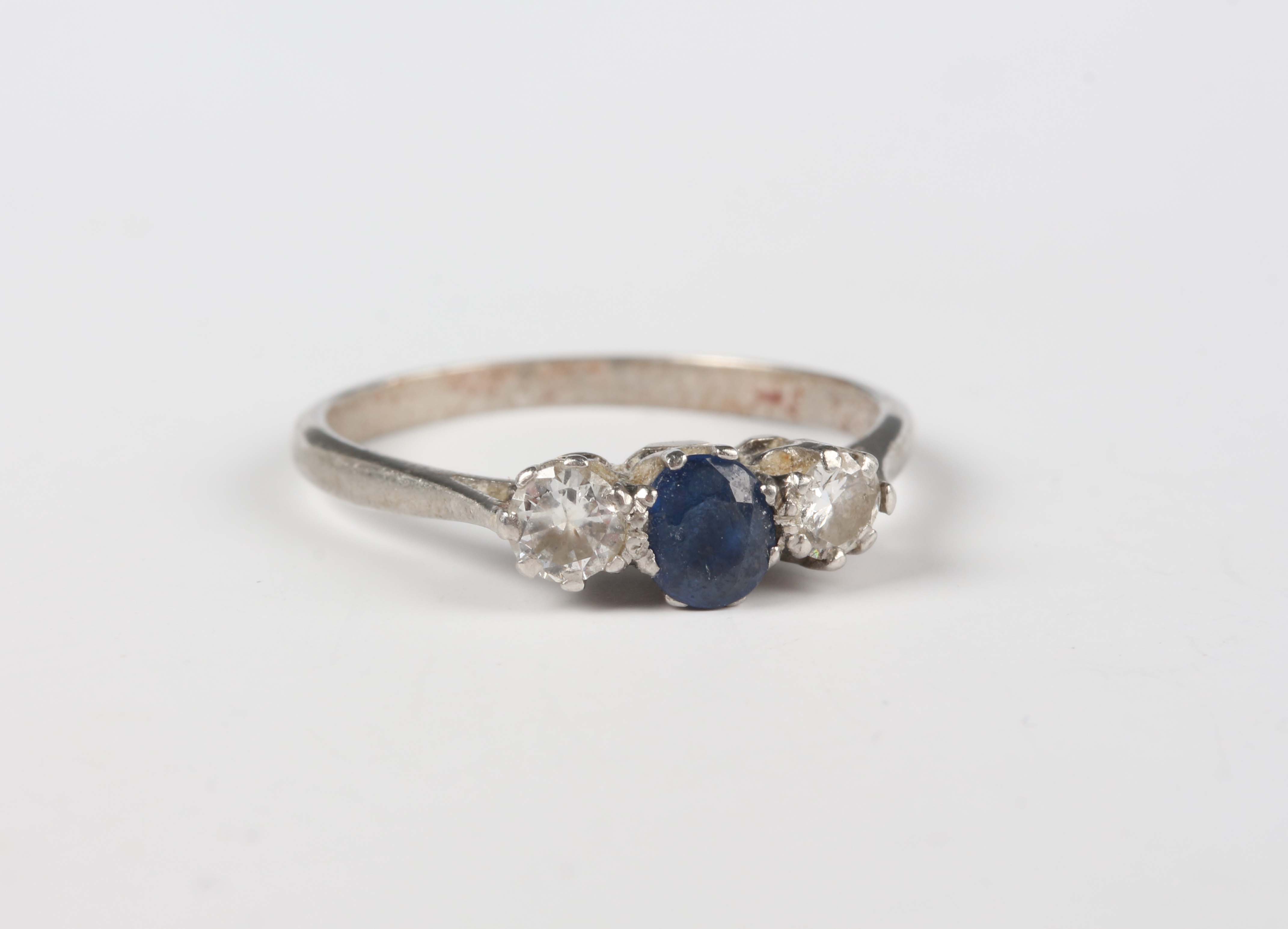 A platinum, sapphire and diamond ring, claw set with the oval cut sapphire between two circular cut diamonds, unmarked, weight 2.2g, ring size approx J.