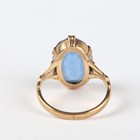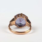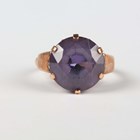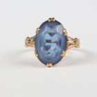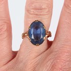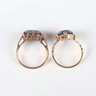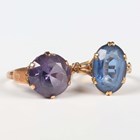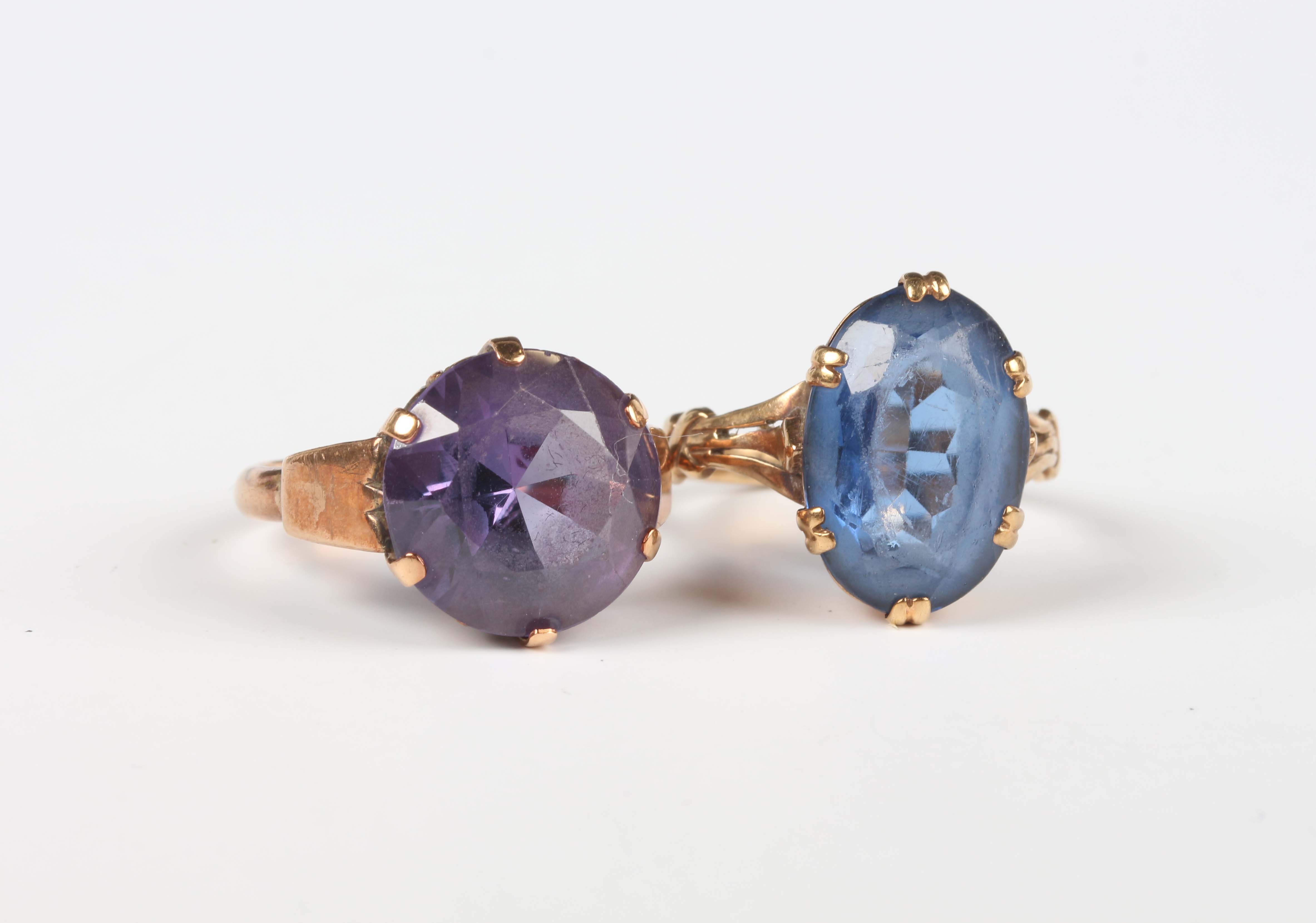 A gold ring, mounted with a circular cut synthetic colour change sapphire, detailed ‘9ct’, ring size approx K1/2, and a gold and blue paste single stone ring, detailed ‘9ct’, ring size approx L, total weight 8.5g.