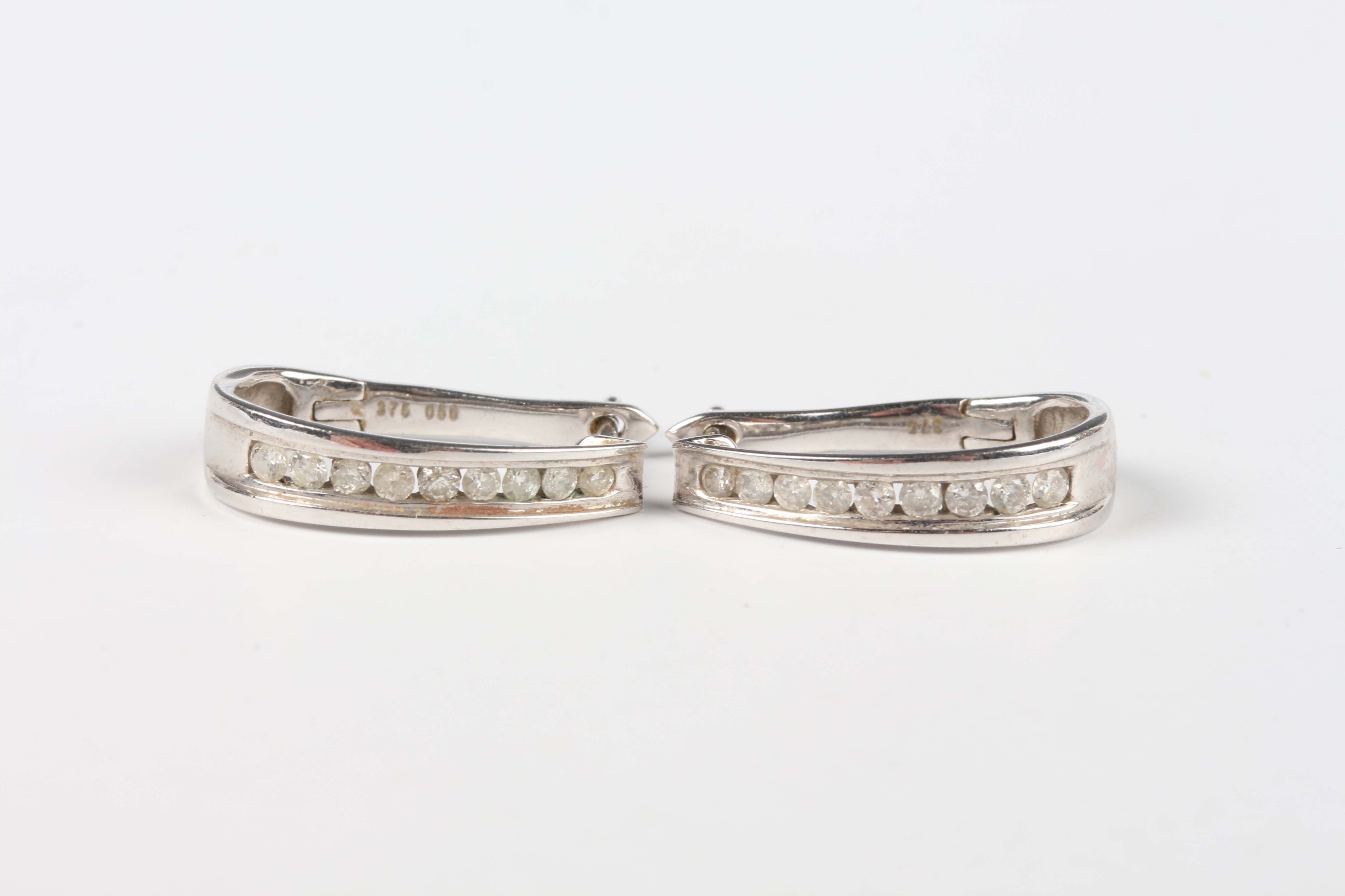 A pair of 9ct white gold and diamond half hoop earrings, each mounted with a row of circular cut diamonds, with post and hinged fittings, weight 4.3g, length 2cm.