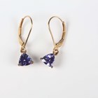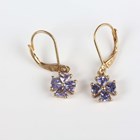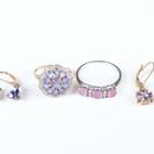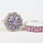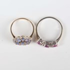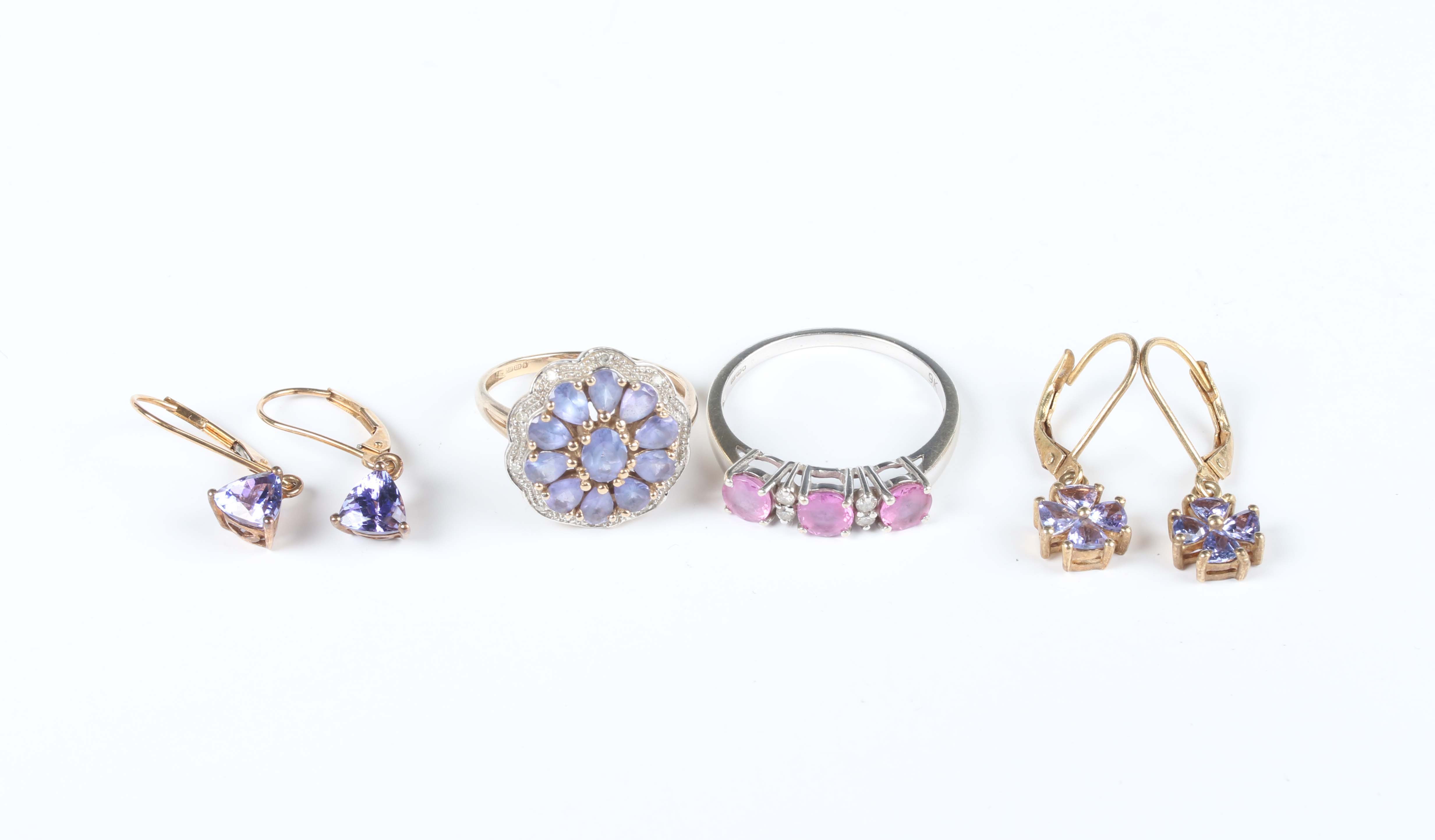 A gold, tanzanite and diamond ring in a flowerhead shaped design, ring size approx O, a 9ct white gold, pink sapphire and diamond ring, ring size approx T, a pair of 9ct gold and tanzanite earrings, total weight 7.6g, and a pair of silver gilt and purple gemstone earrings.