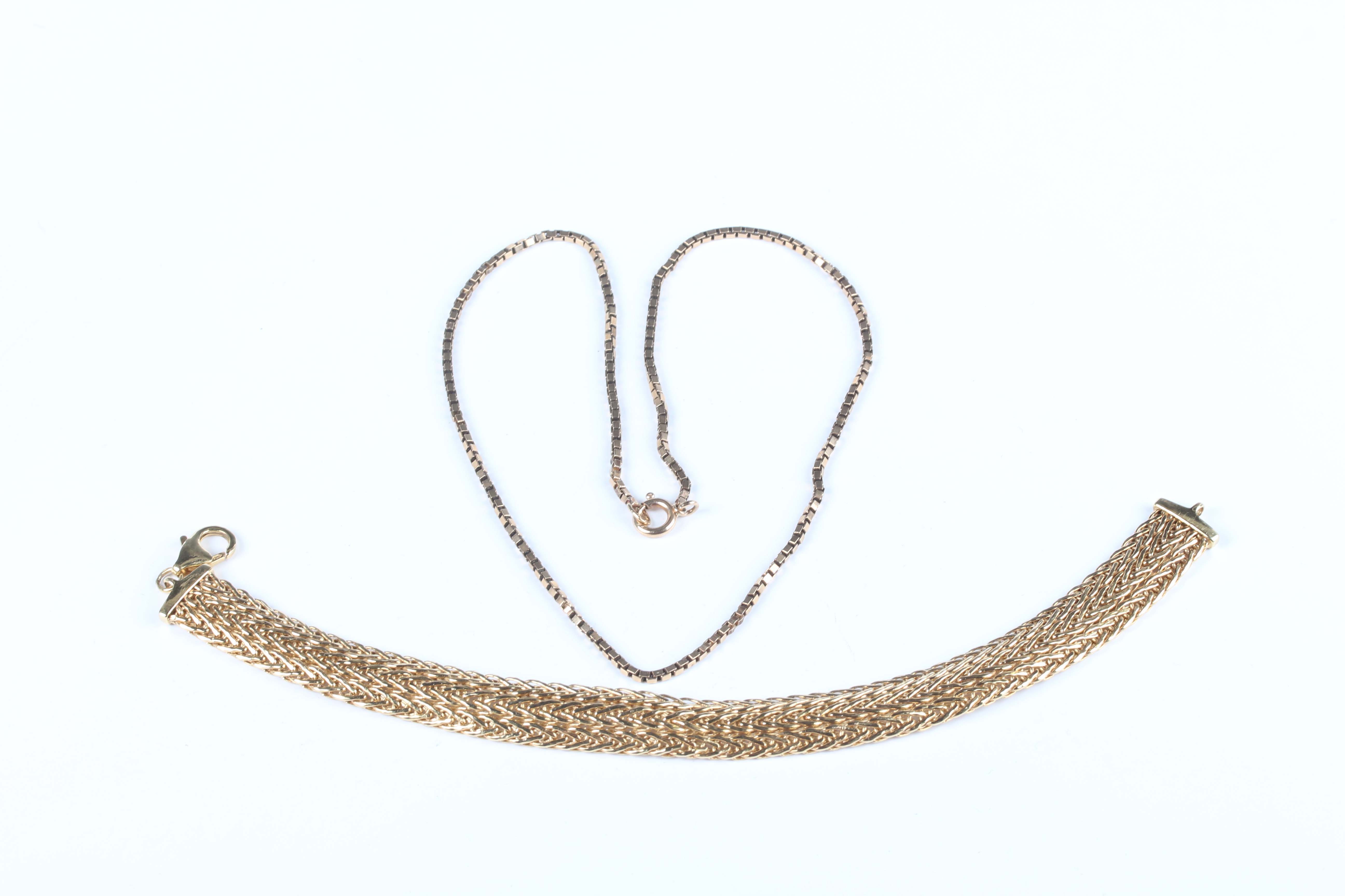 An Italian gold mesh link bracelet on a sprung hook shaped clasp, detailed ‘Italy 375’, length 19.5cm, and a gold box link neckchain, detailed ‘375’, on a boltring clasp, length 37cm, total weight 13g, with an associated case.