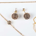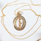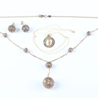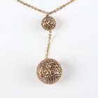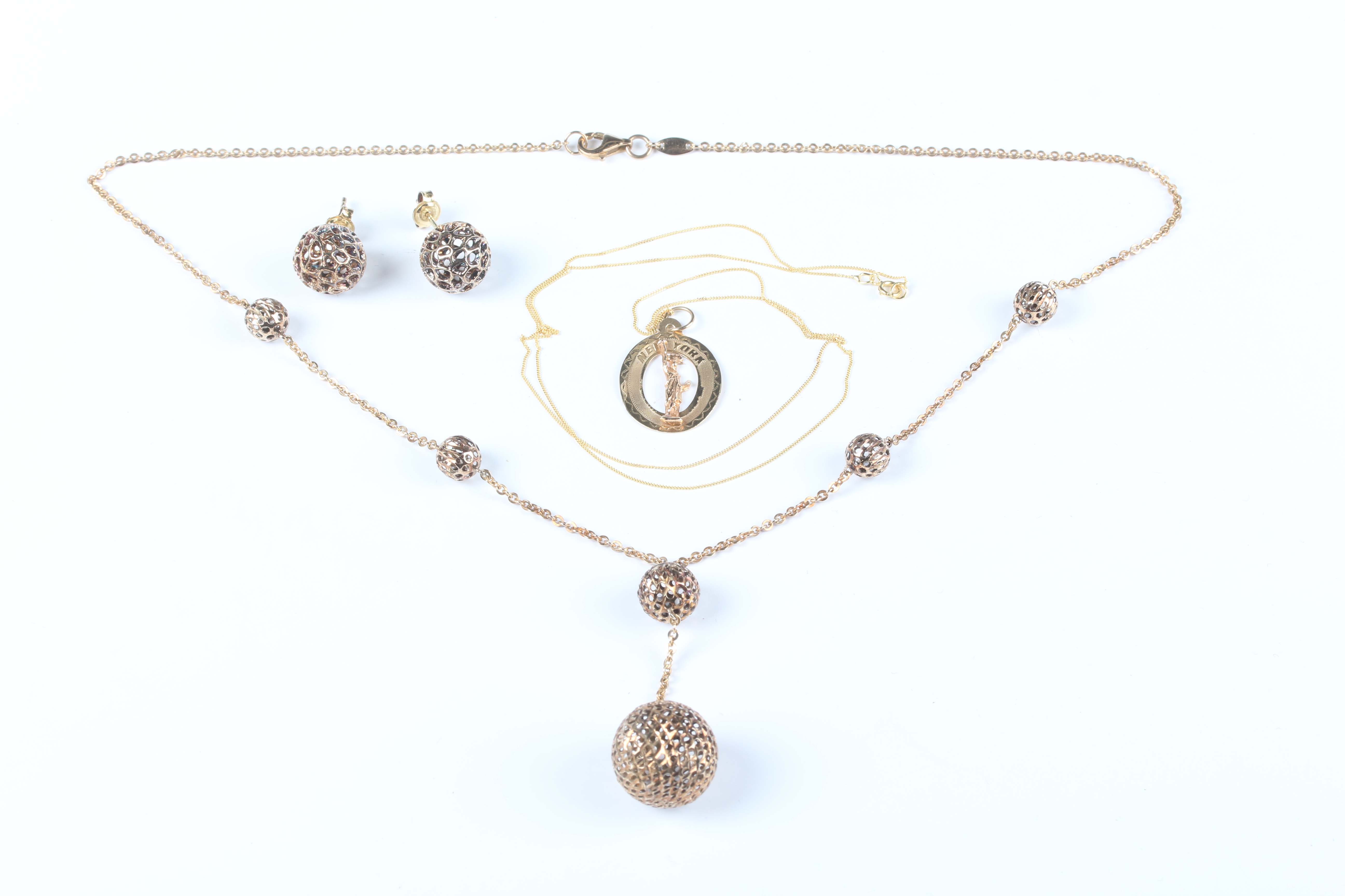 A 9ct gold oval and pierced ball link necklace on a sprung hook shaped clasp, weight 5.1g, length 43cm, a pair of similar gilt metal earrings, unmarked, each butterfly detailed ‘925’, and a gold pendant depicting the Statue of Liberty, detailed ‘14K’, weight 0.9g, with a gold neckchain on a boltring clasp, detailed ‘375’, weight 0.4g.