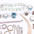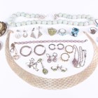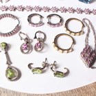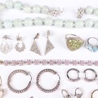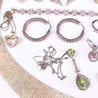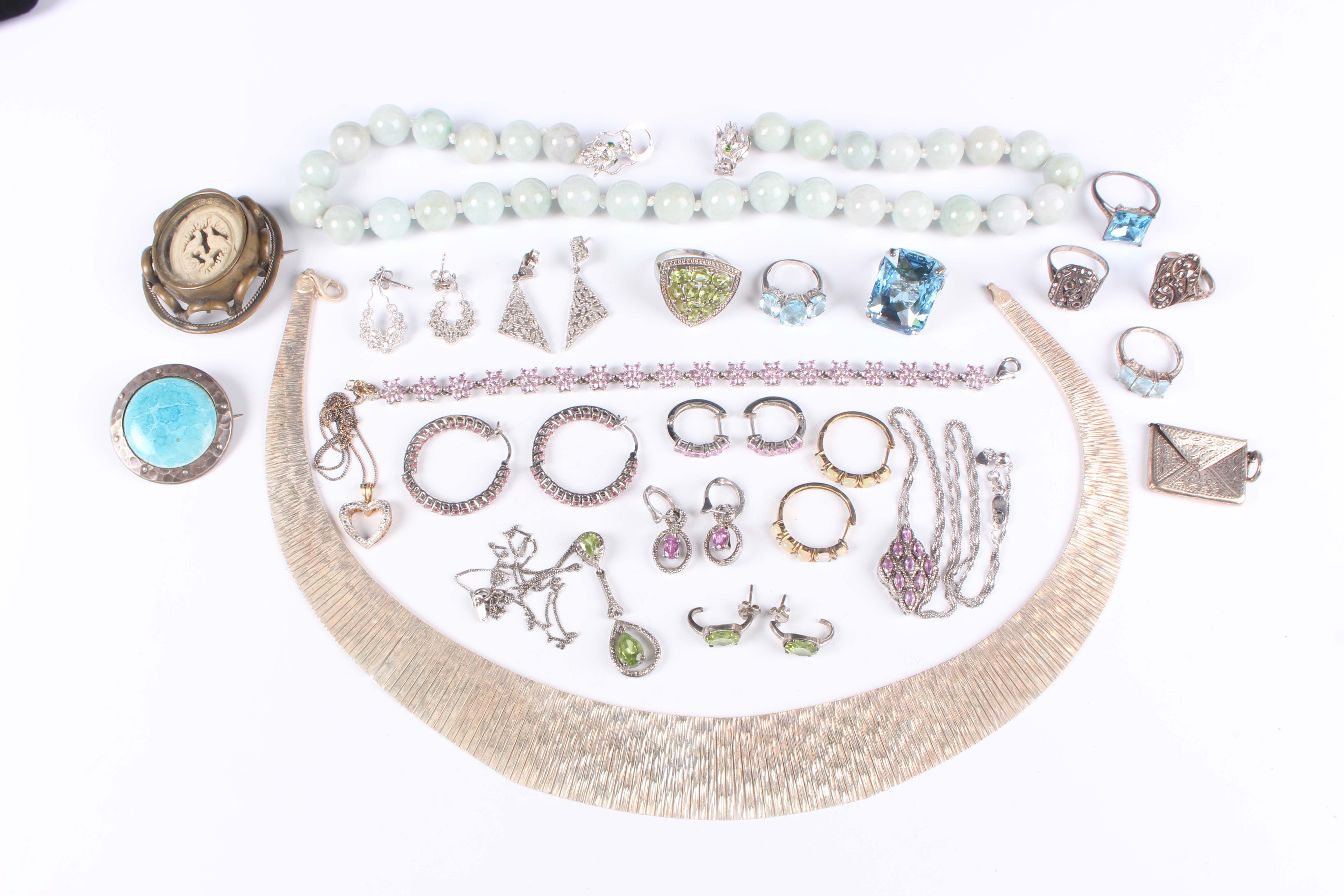 A group of mostly silver and silver mounted jewellery, including an Italian silver collar necklace, weight 45.6g, length 44cm, a pair of opal hoop shaped earrings, a peridot pendant necklace with a similar pair of earrings, two pairs of baguette cut diamond set pendant earrings, each in a pierced design, and an Edwardian silver stamp case in the form of an envelope, Birmingham 1902, weight 5g.