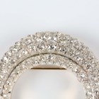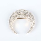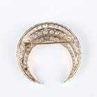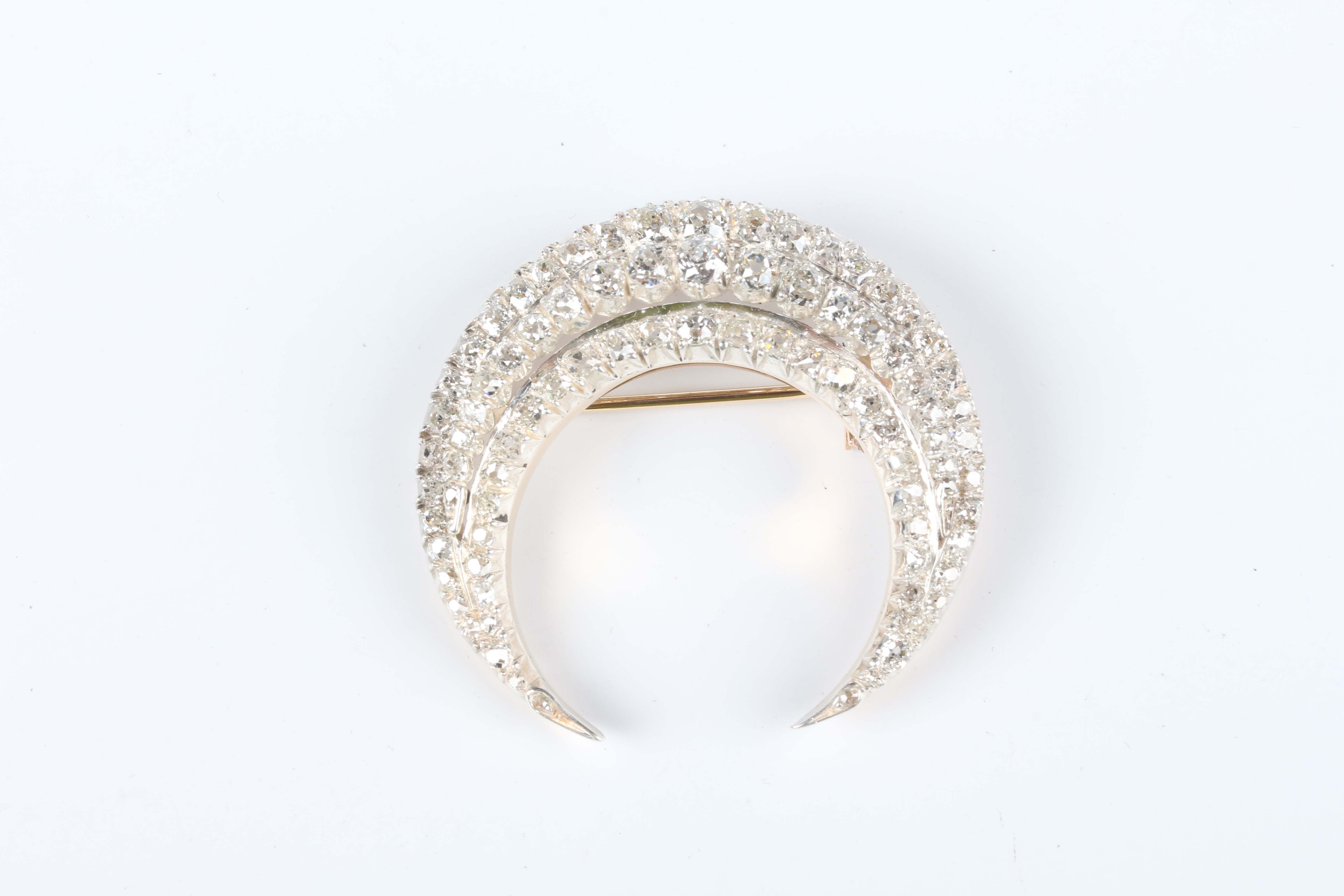 A gold backed, silver set and diamond brooch, designed as a crescent, mounted with three rows of graduated cushion shaped diamonds, unmarked, weight 15.1g, total diamond weight approx 4.00-5.00ct, width 4.3cm.