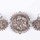 A Victorian silver shaped circular brooch, the centre with a floral and foliate motif, bearing registration lozenge, diameter 3.5cm, and a matching pair of pendant earrings, length 2.9cm, total weight 15.6g.