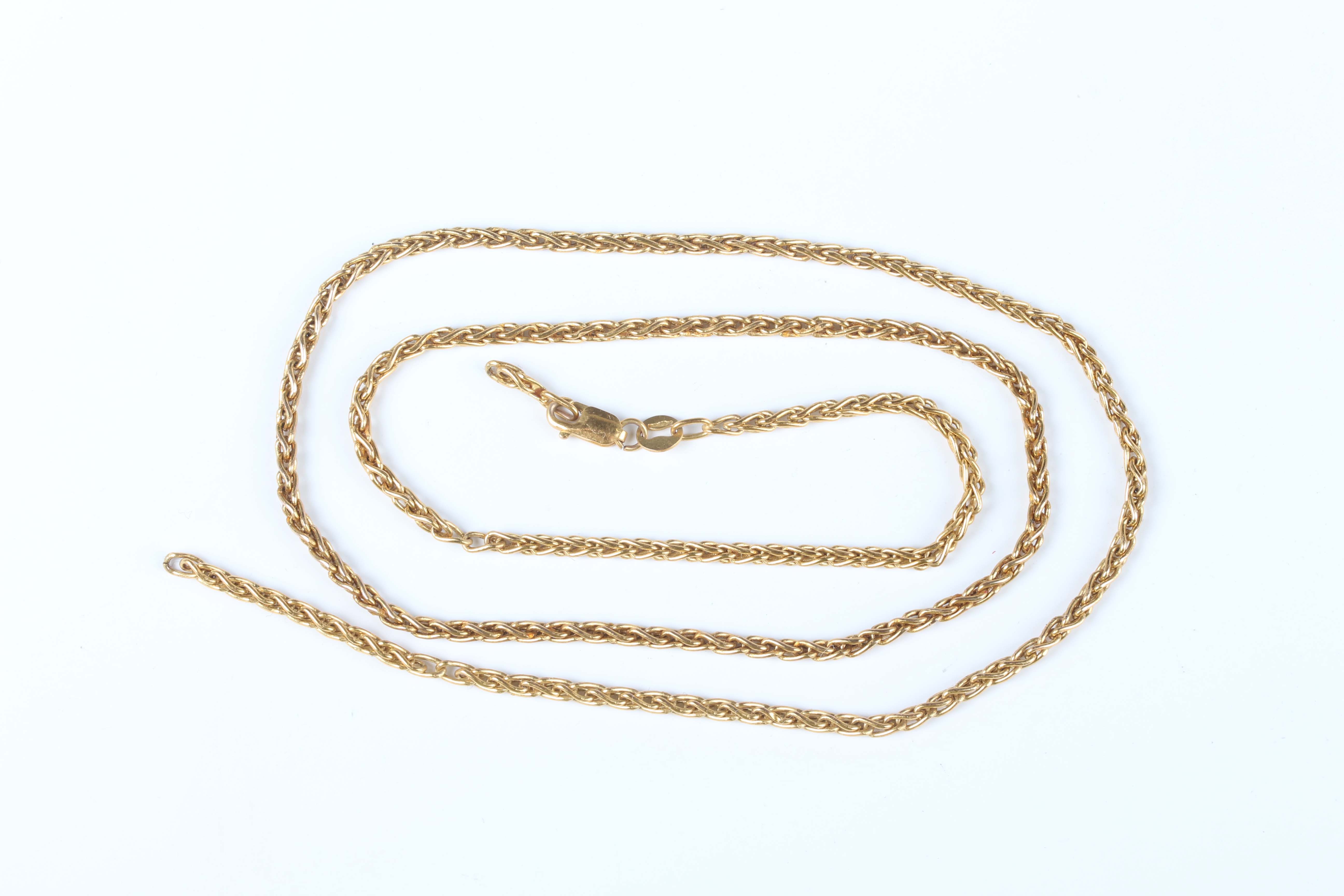 A gold wheat link neckchain on a sprung hook shaped clasp, detailed ‘9K’, weight 4g, length 52cm (broken).