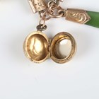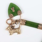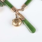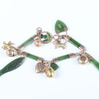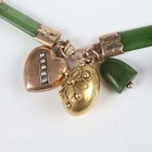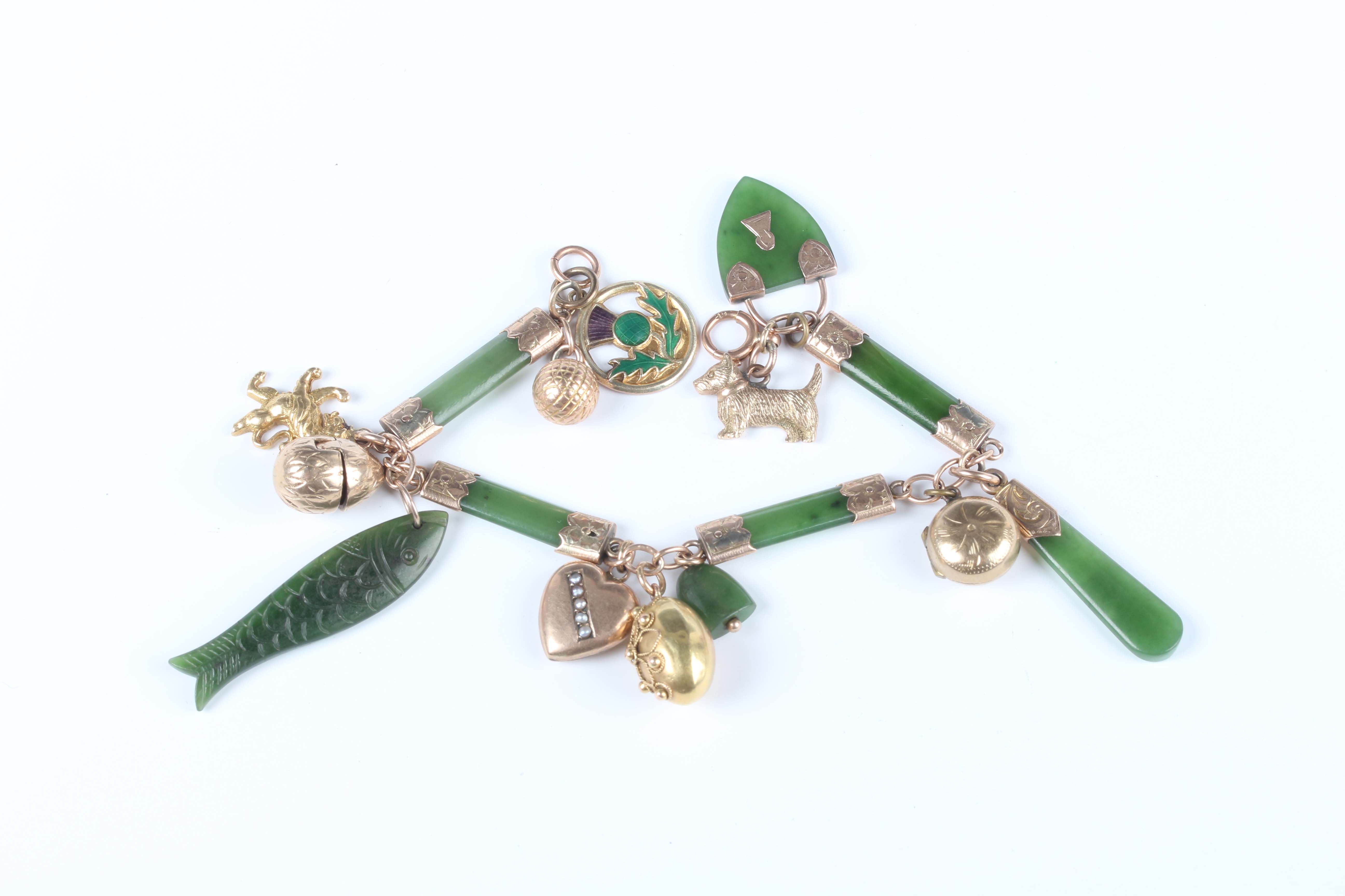 A gold and nephrite bracelet in a bar form link design, fitted with twelve pendants and charms, comprising two 9ct gold charms, a gold terrier dog, detailed ‘9ct’, a gold golf ball, detailed ‘9ct’, a gold back and front locket, an egg shaped charm opening to reveal a chick, unmarked, another egg shaped charm, applied with bead and wirework decoration, unmarked, a lion charm, unmarked, and four nephrite charms, total weight 27.4g, length 18cm.