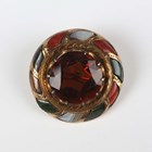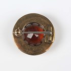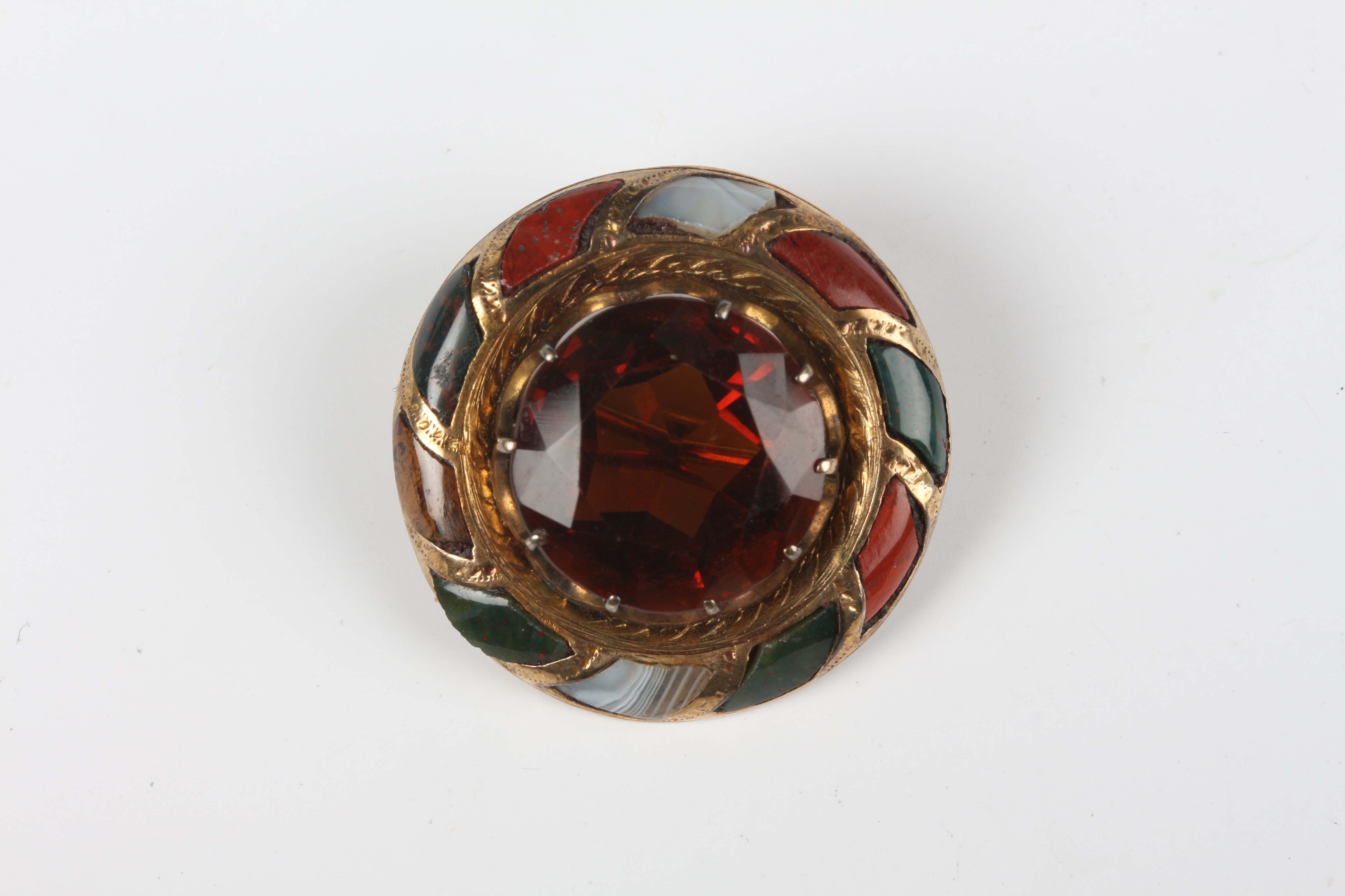 A gold, varicoloured agate and citrine circular brooch, probably Scottish, circa 1900, claw set with the circular cut citrine within a surround of varicoloured agates, unmarked, weight 5.4g, diameter 2.5cm.
