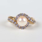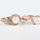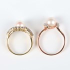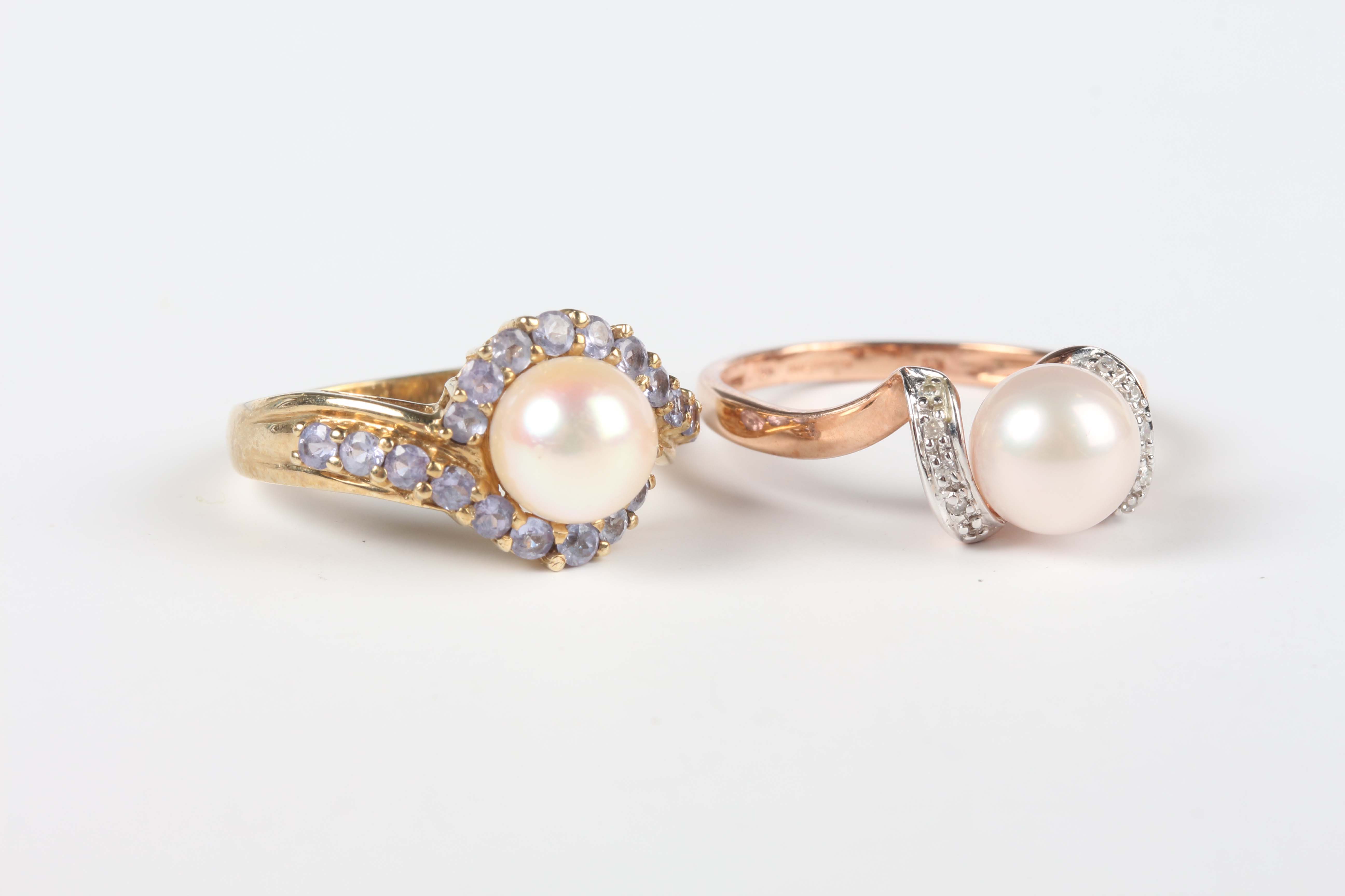 A 9ct rose gold, cultured pearl and diamond ring, mounted with a single cultured pearl at the centre, Birmingham 2004, ring size approx P1/2, and a 9ct gold, cultured pearl and tanzanite ring, ring size approx M1/2, total weight 5.9g.