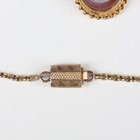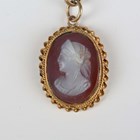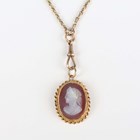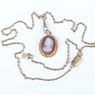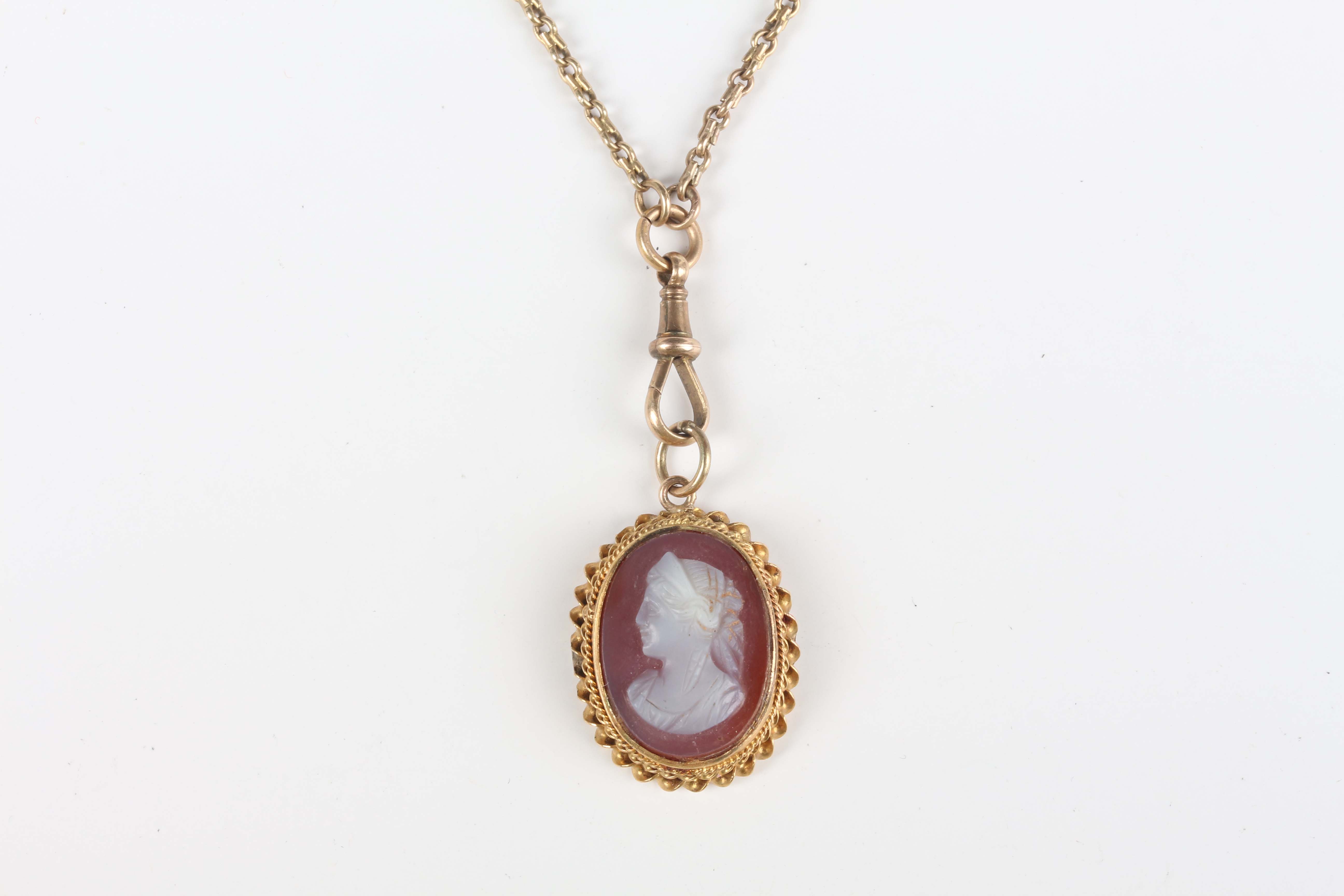 A gold fancy link neckchain on a snap clasp, unmarked, fitted with a gold swivel, detailed ‘9ct’, total weight 7g, and a gold and agate oval cameo, carved as a portrait of a classical lady, unmarked, weight 3.2g.
