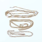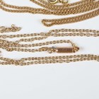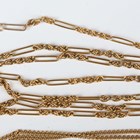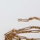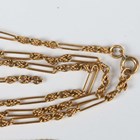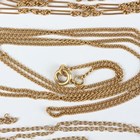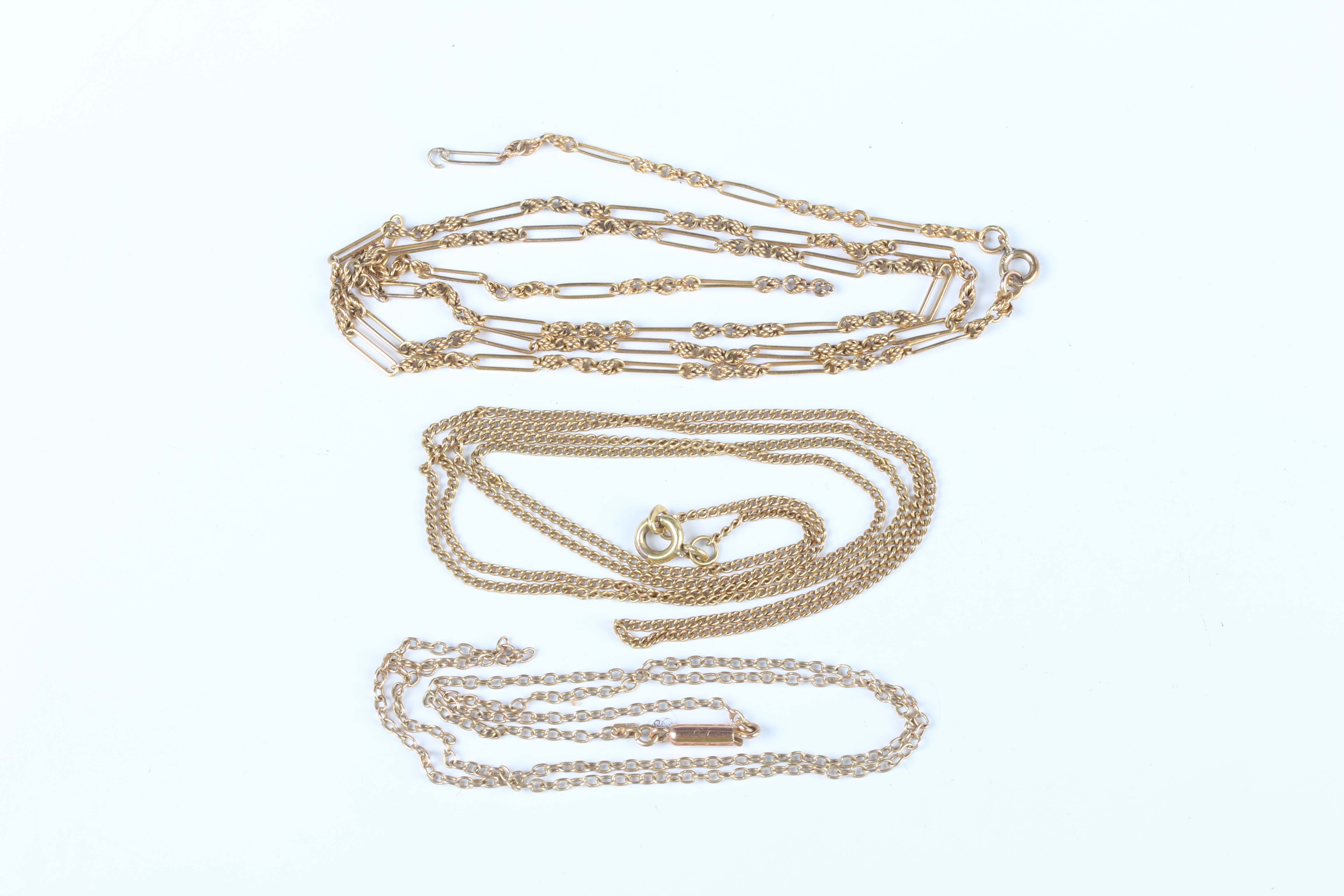 A gold oval link neckchain, detailed ‘15ct’, on a cylindrical clasp, detailed ‘15ct’, weight 2.2g, length 39.5cm, a gold fancy link neckchain, detailed ‘9’, weight 4.9g (broken), and another gold curblink neckchain, unmarked, weight 4.4g.