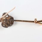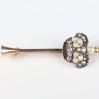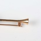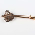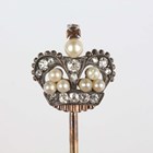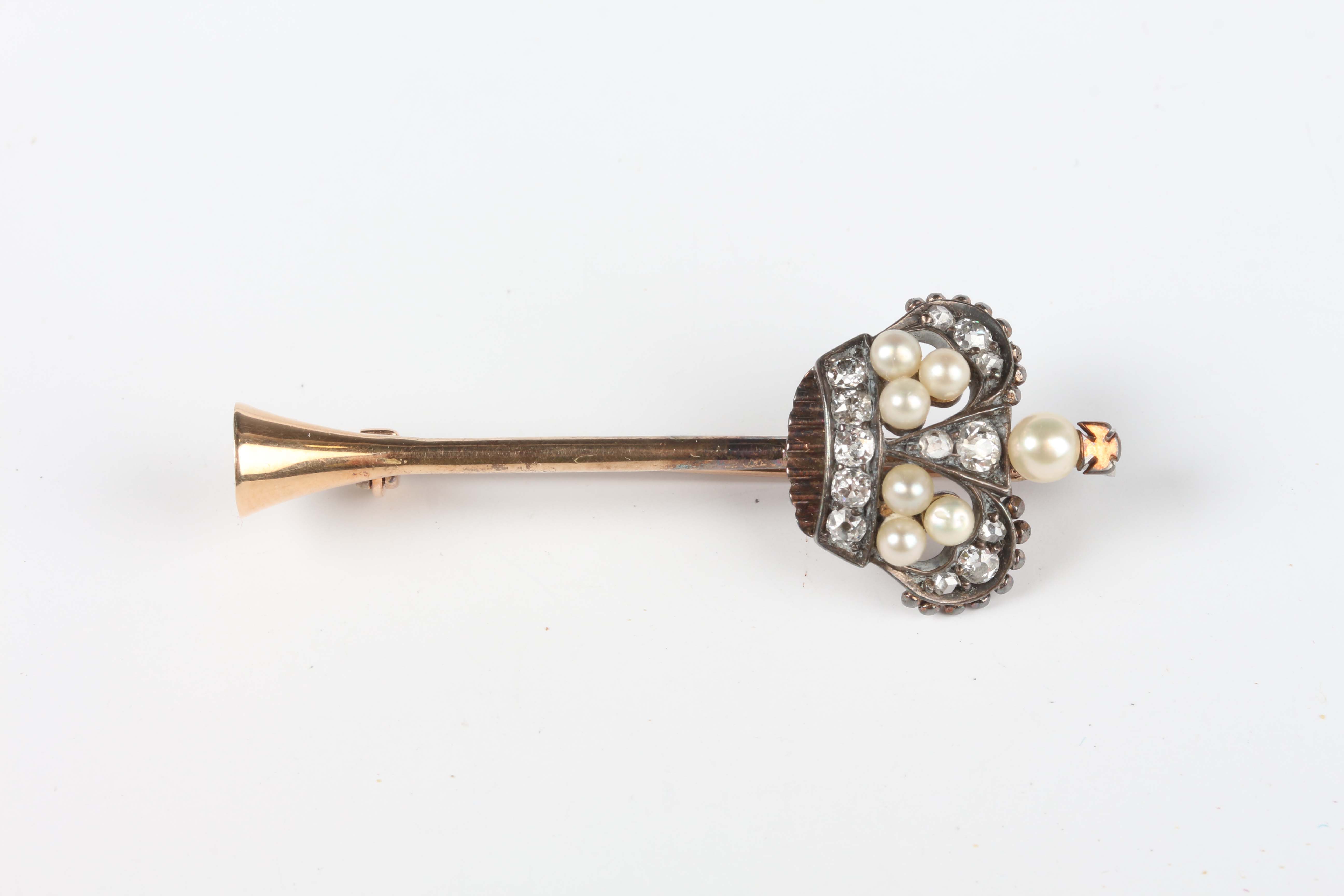 A gold and silver set, pearl and diamond bar brooch, the bar designed as a hunting horn, applied with a crown mounted with pearls and old cut diamonds, unmarked, weight 5.1g, width 5cm.