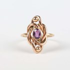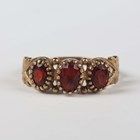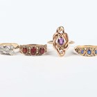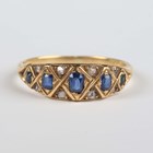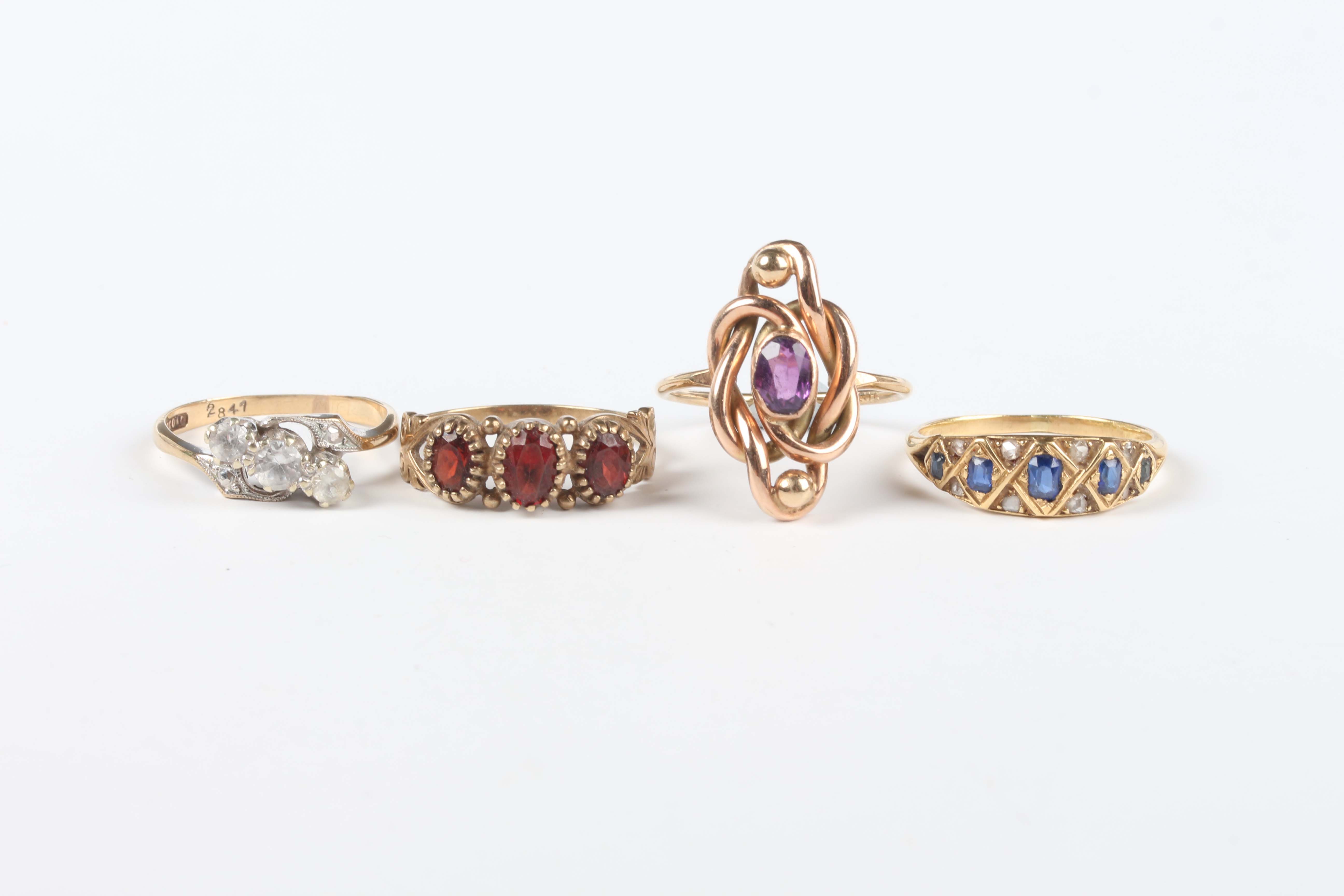 A 9ct gold and garnet three stone ring, Birmingham 1994, ring size approx N, a gold and amethyst single stone ring, detailed ‘9ct’, a gold and colourless gem set three stone ring, detailed ‘9ct Gold’, total weight 6.6g, and a gold, sapphire, blue gem and diamond ring, unmarked, weight 2.9g.