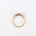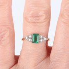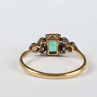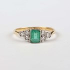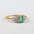 A gold, platinum, emerald and diamond ring, collet set with a rectangular emerald between single cut diamond three stone shoulders, detailed ‘18ct Plat’, weight 2.2g, ring size approx N1/2, with a case.