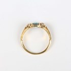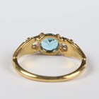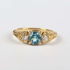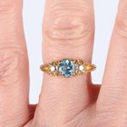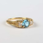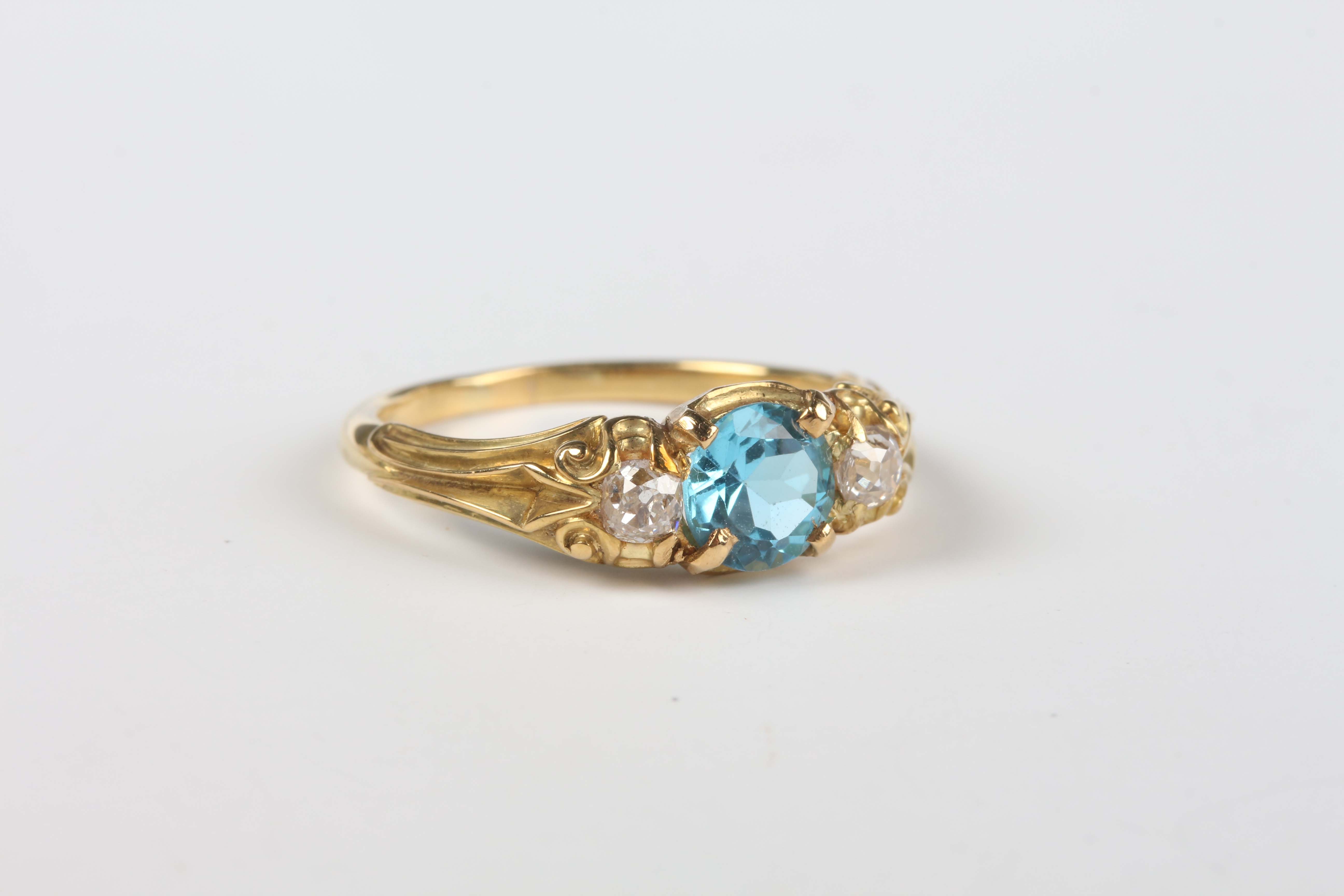 A gold, blue topaz and diamond three stone ring, mounted with a circular cut blue topaz between two old cut diamonds, with scroll decorated shoulders, unmarked, weight 3.2g, ring size approx L1/2, with a case.