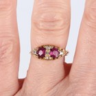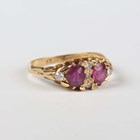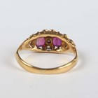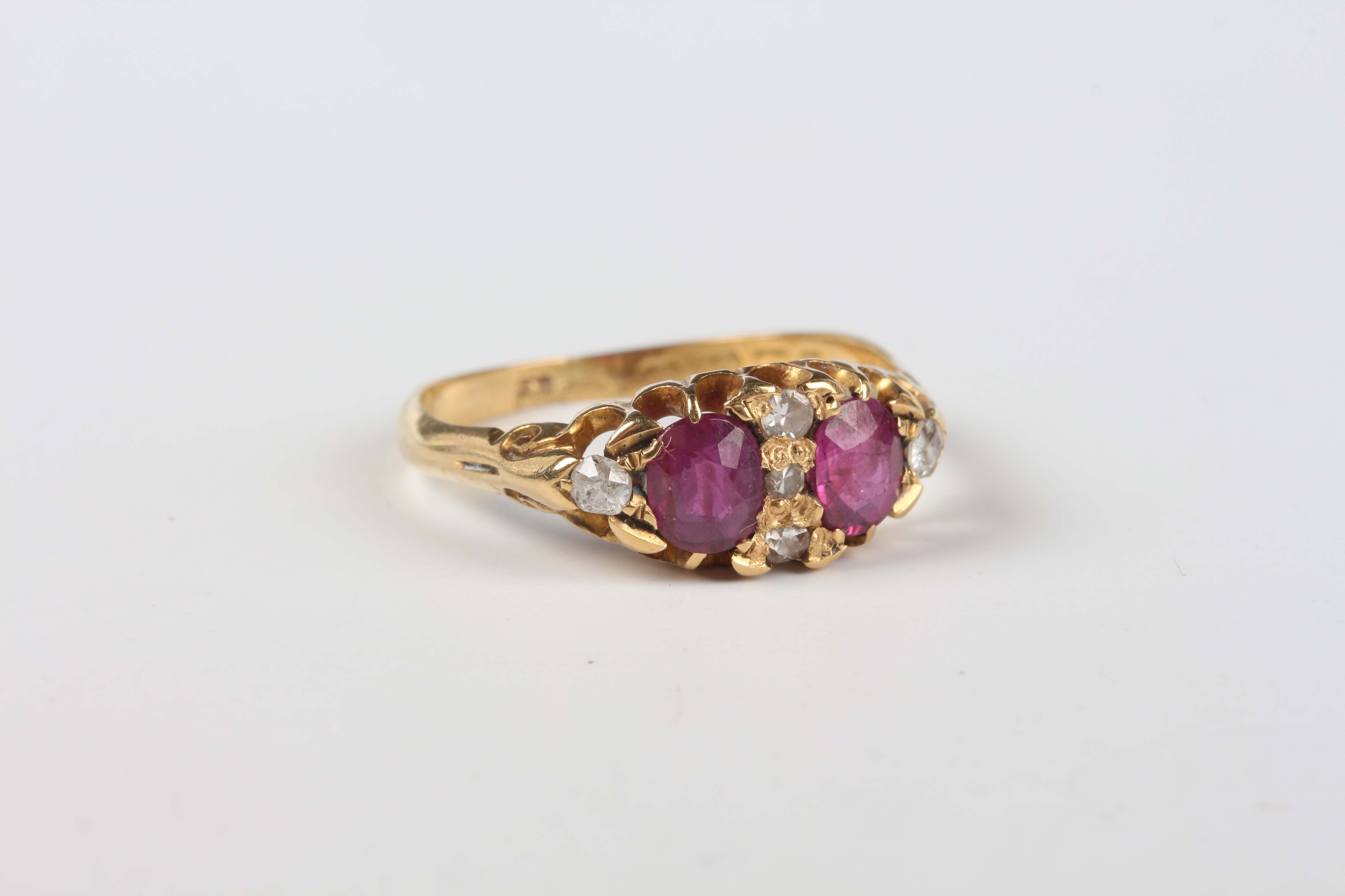 An Edwardian 18ct gold, ruby and diamond ring, mounted with two oval cut rubies and five variously cut diamonds, Birmingham 1901, weight 2.9g, ring size approx N, with a case.